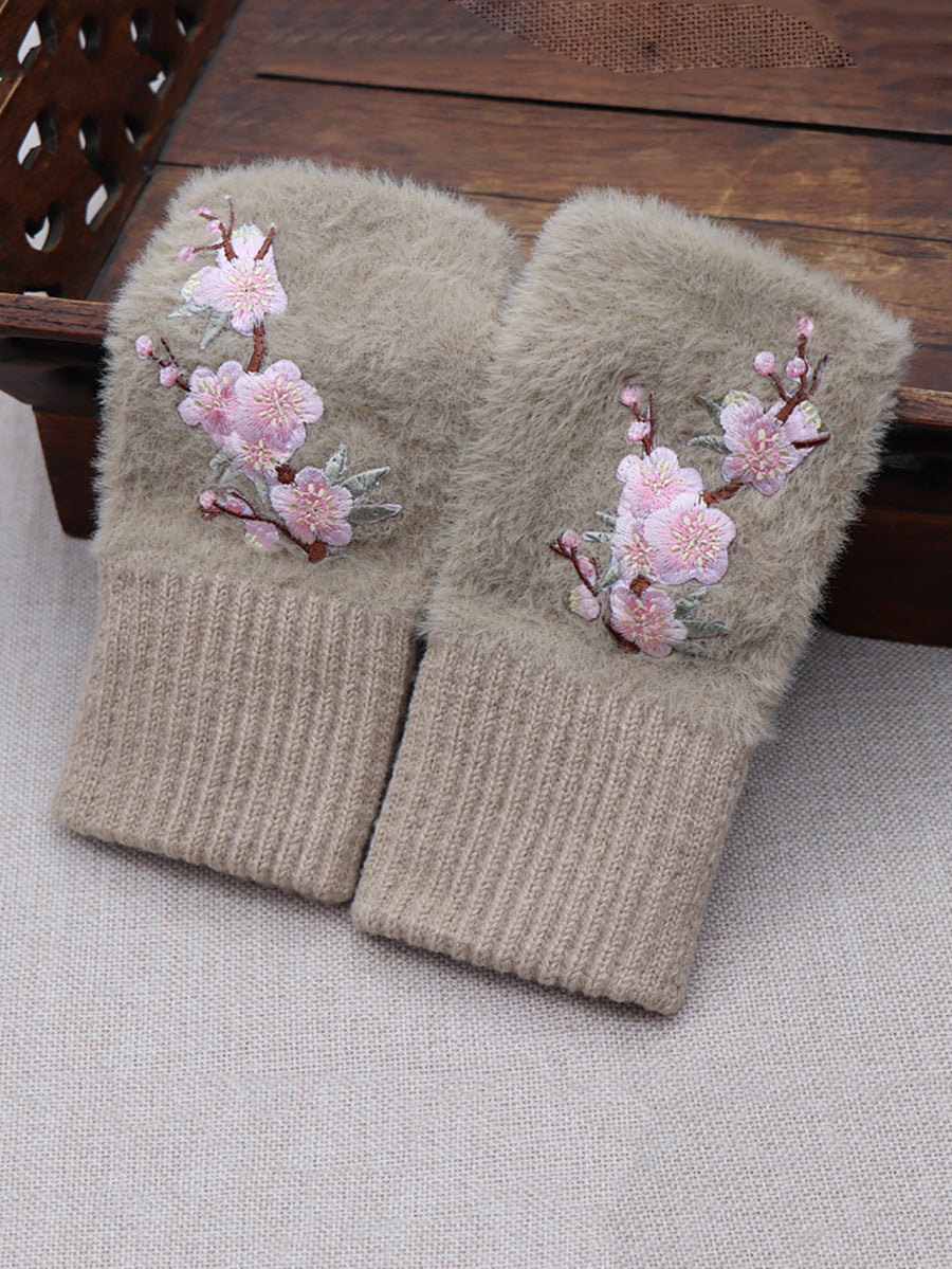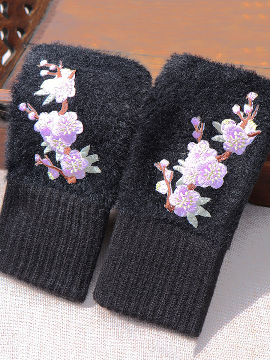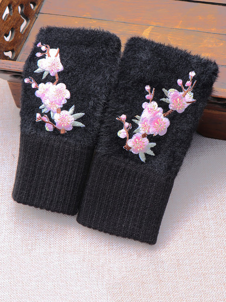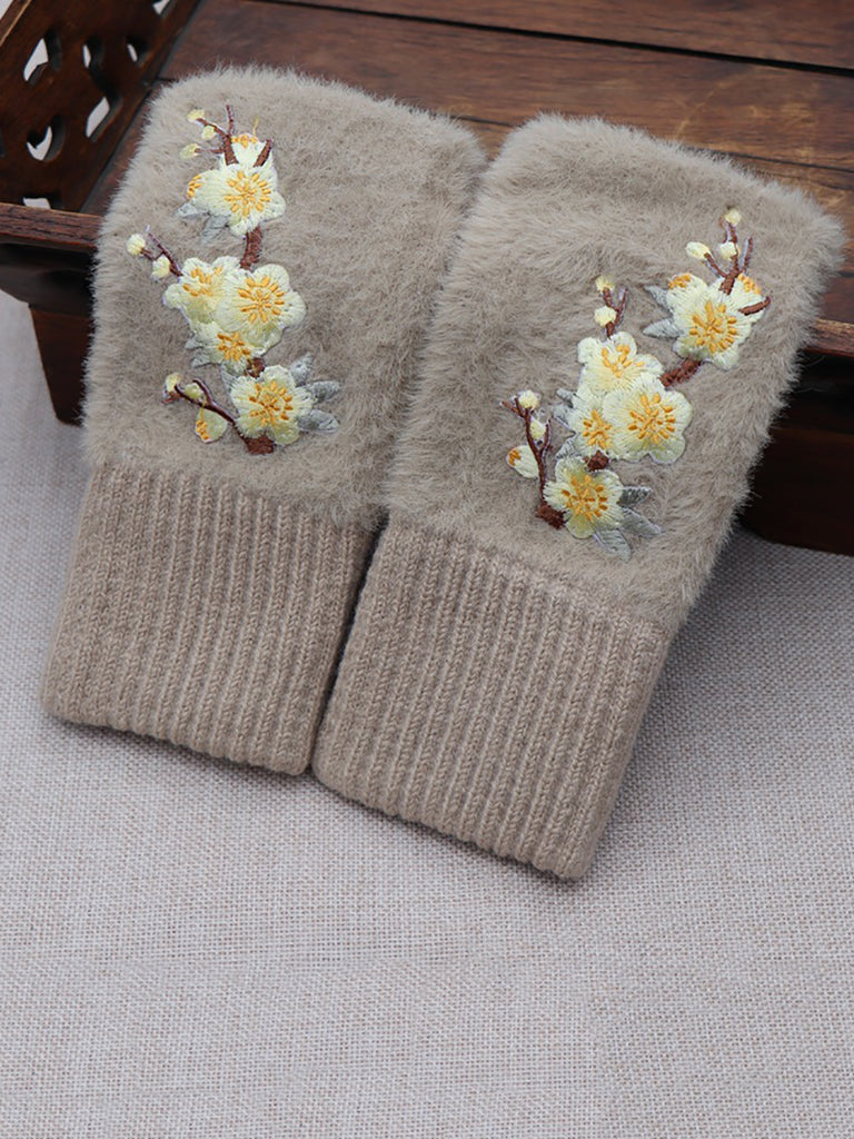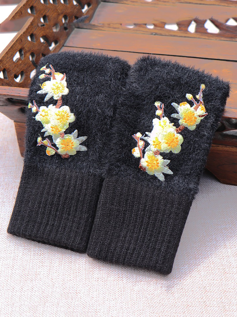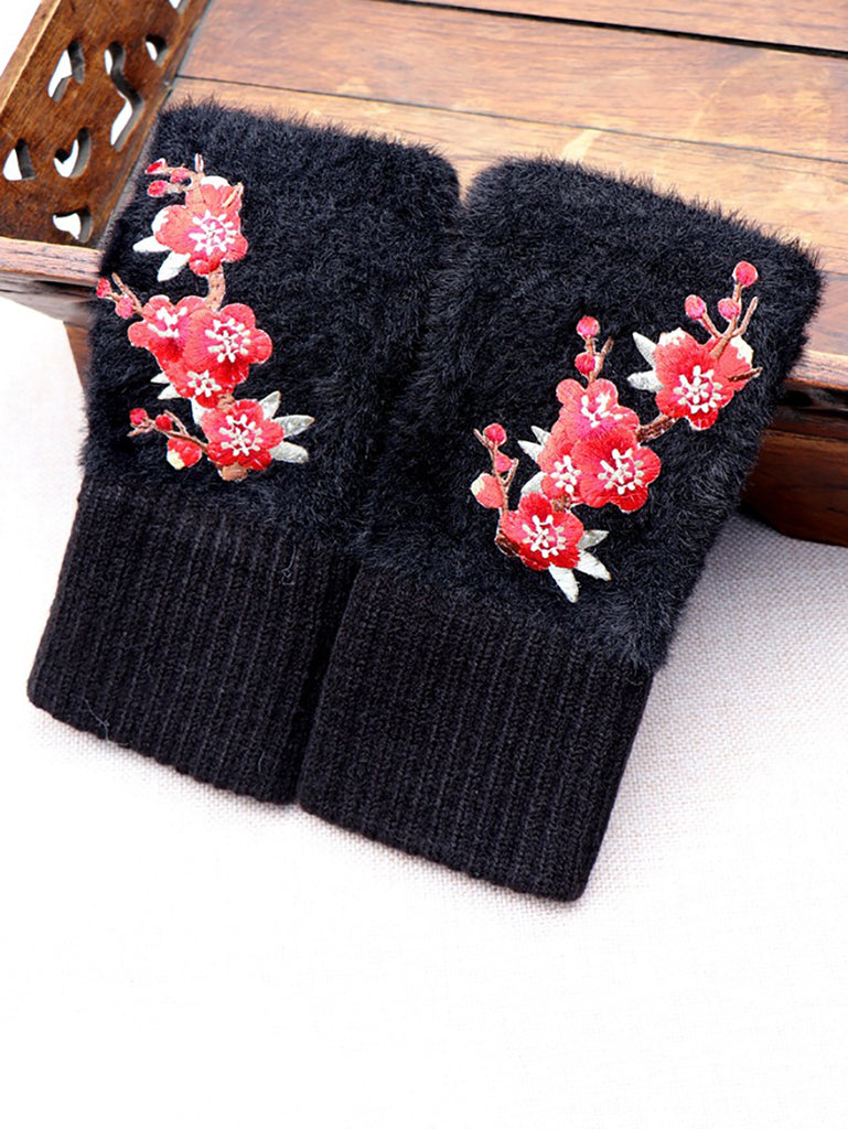 Women Artsy Winter Flower Embroidery Fleece Gloves