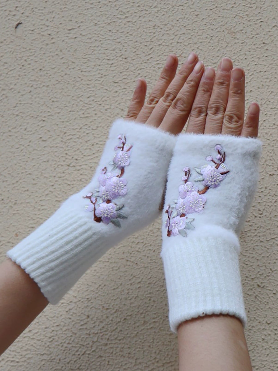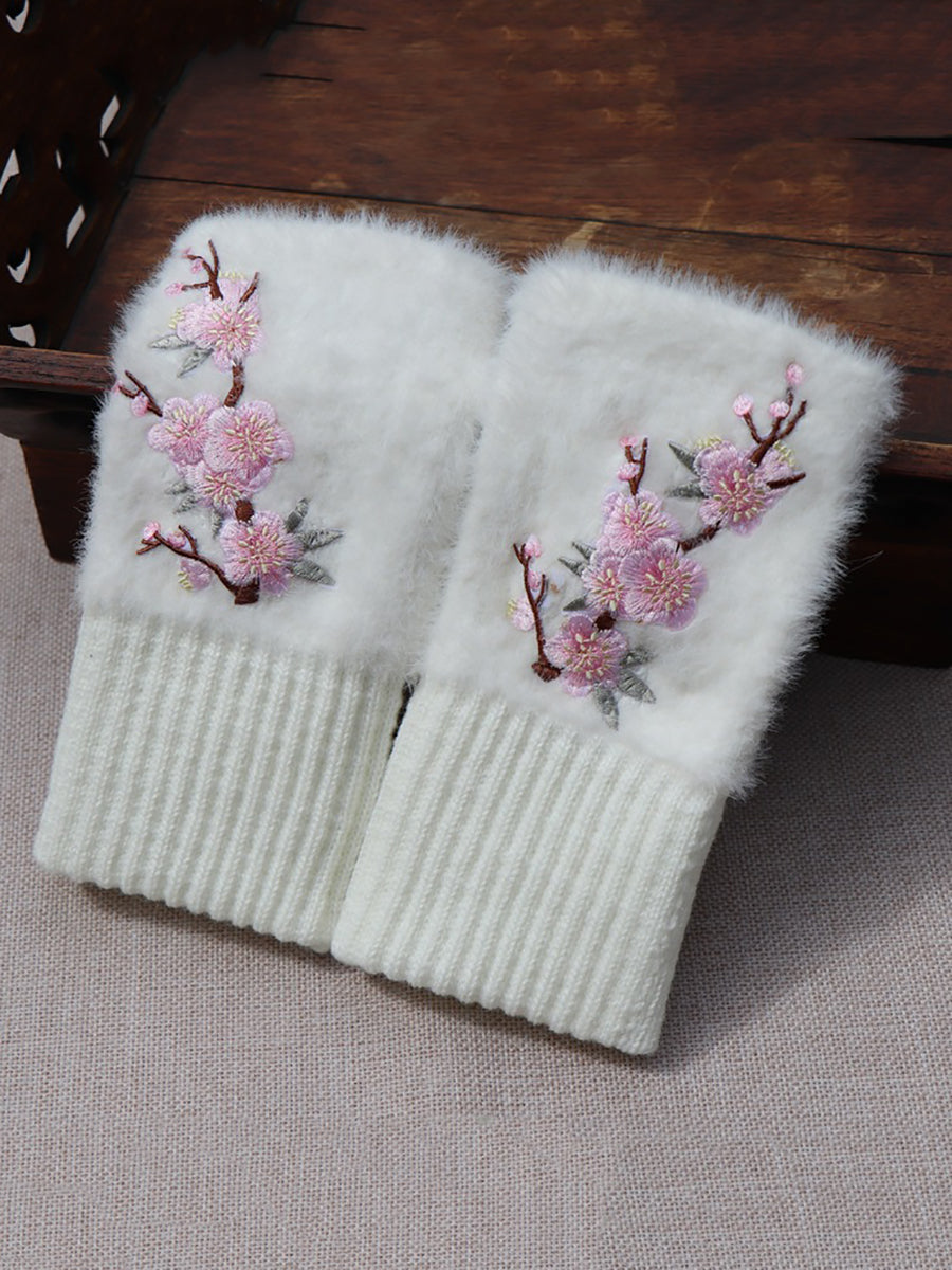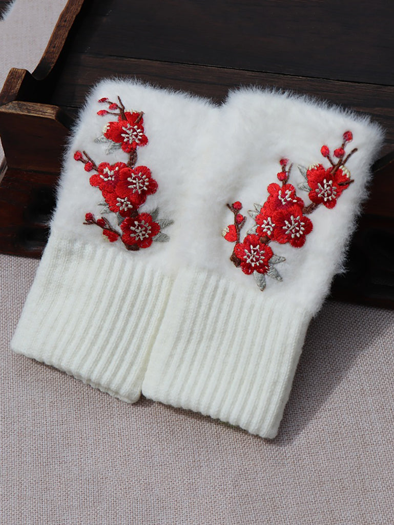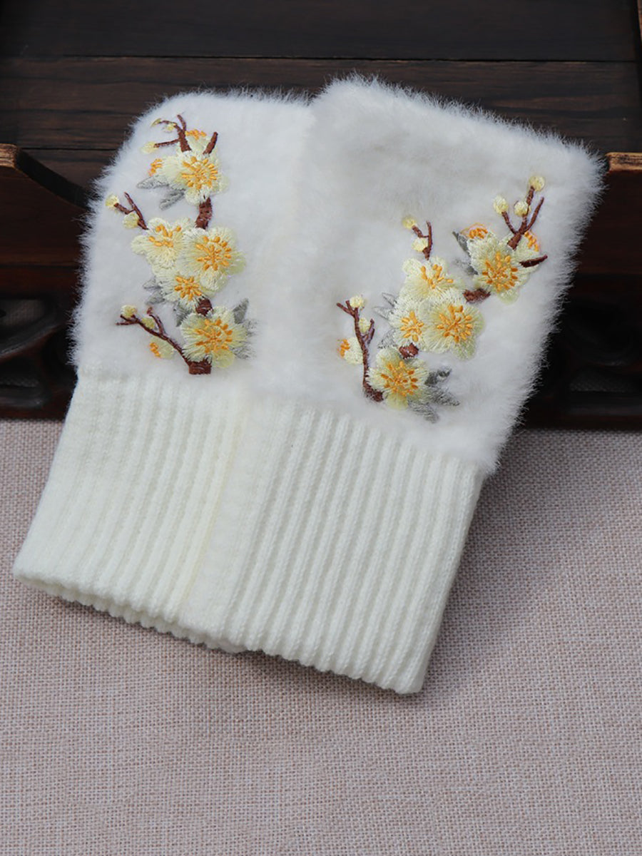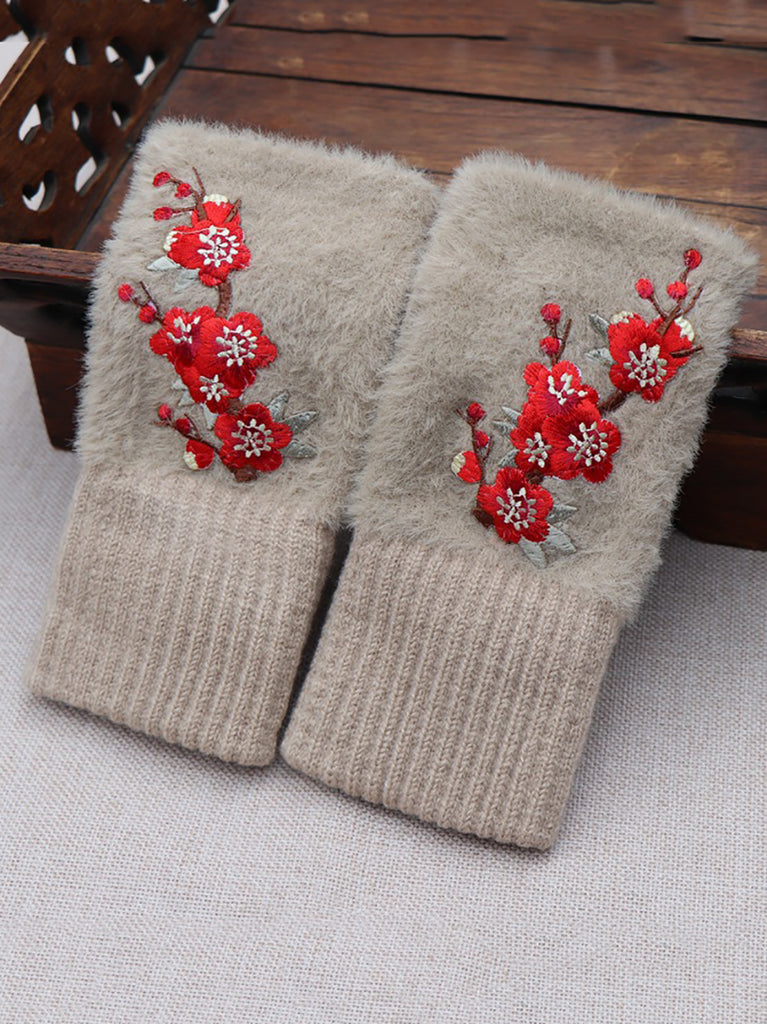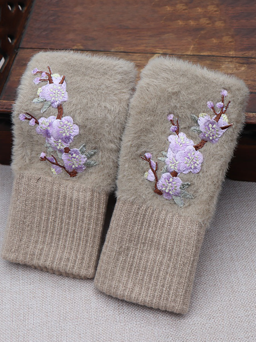 Women Artsy Winter Flower Embroidery Fleece Gloves