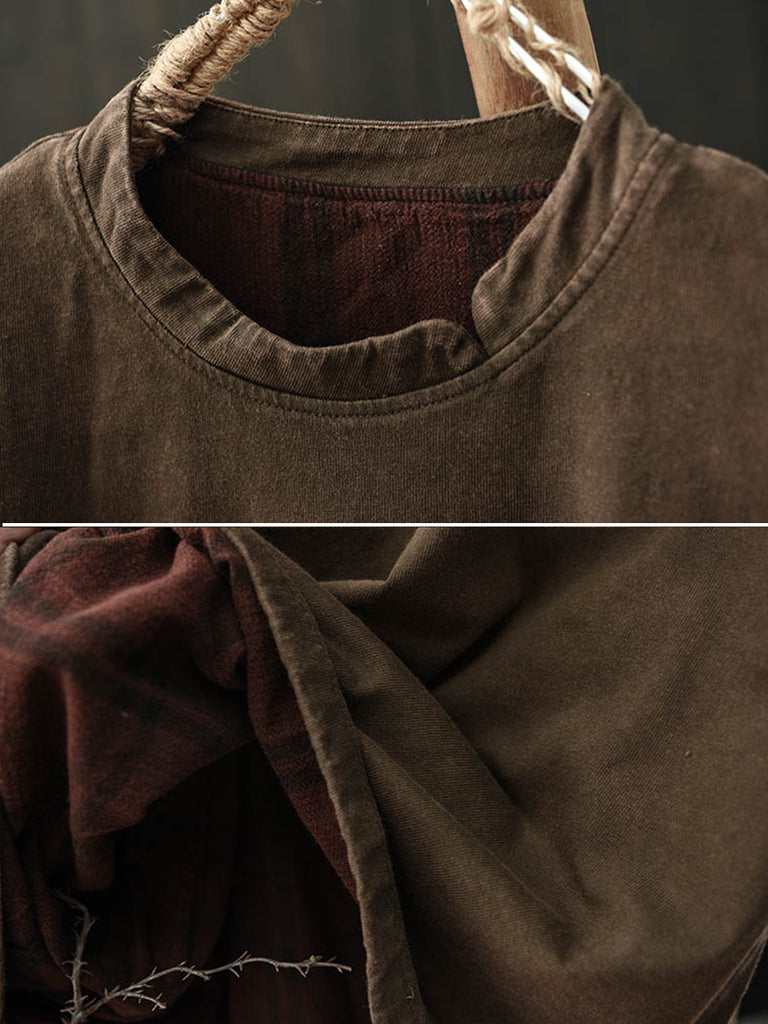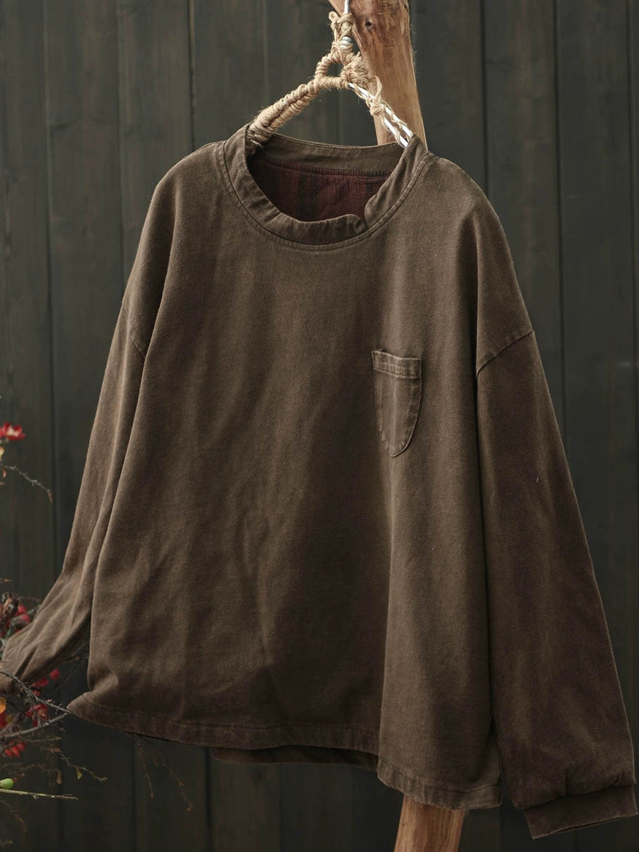 Women Artsy Autumn Pure Color Cotton O-Neck Blouse