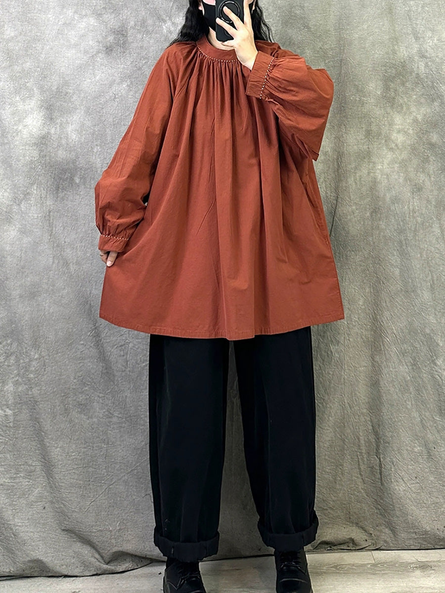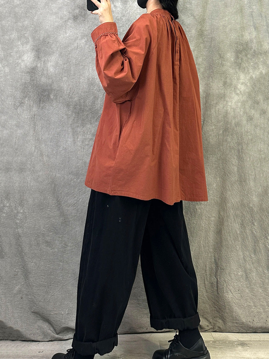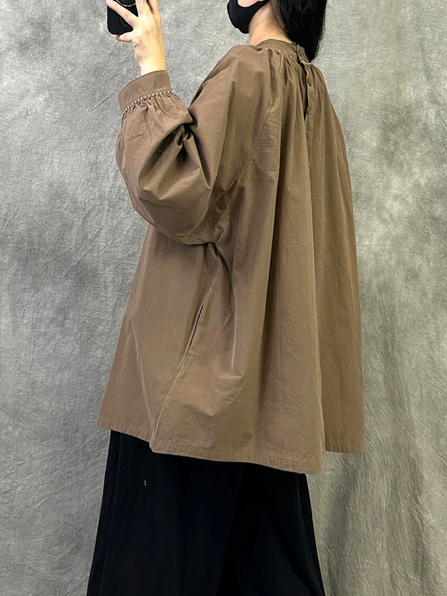 Women Artsy Autumn Pure Color Stand Collar Blouse