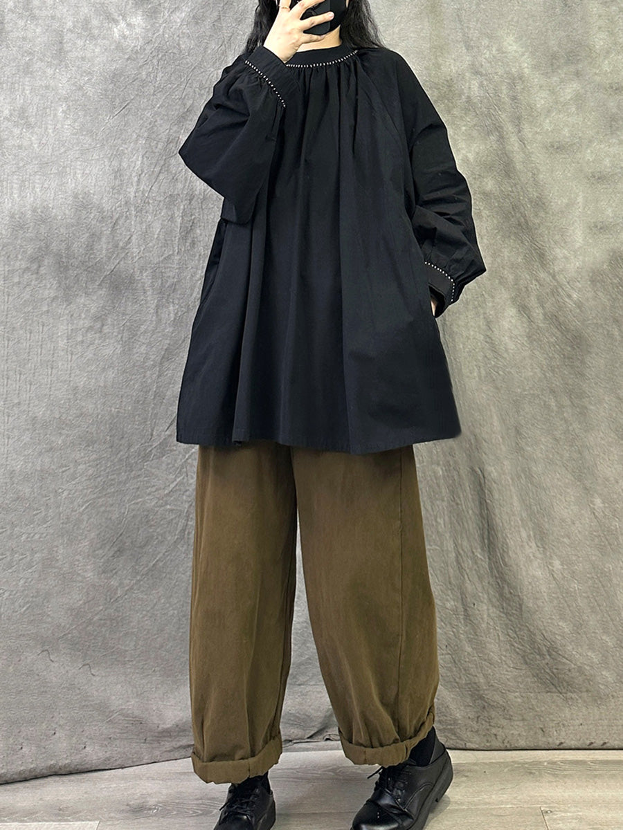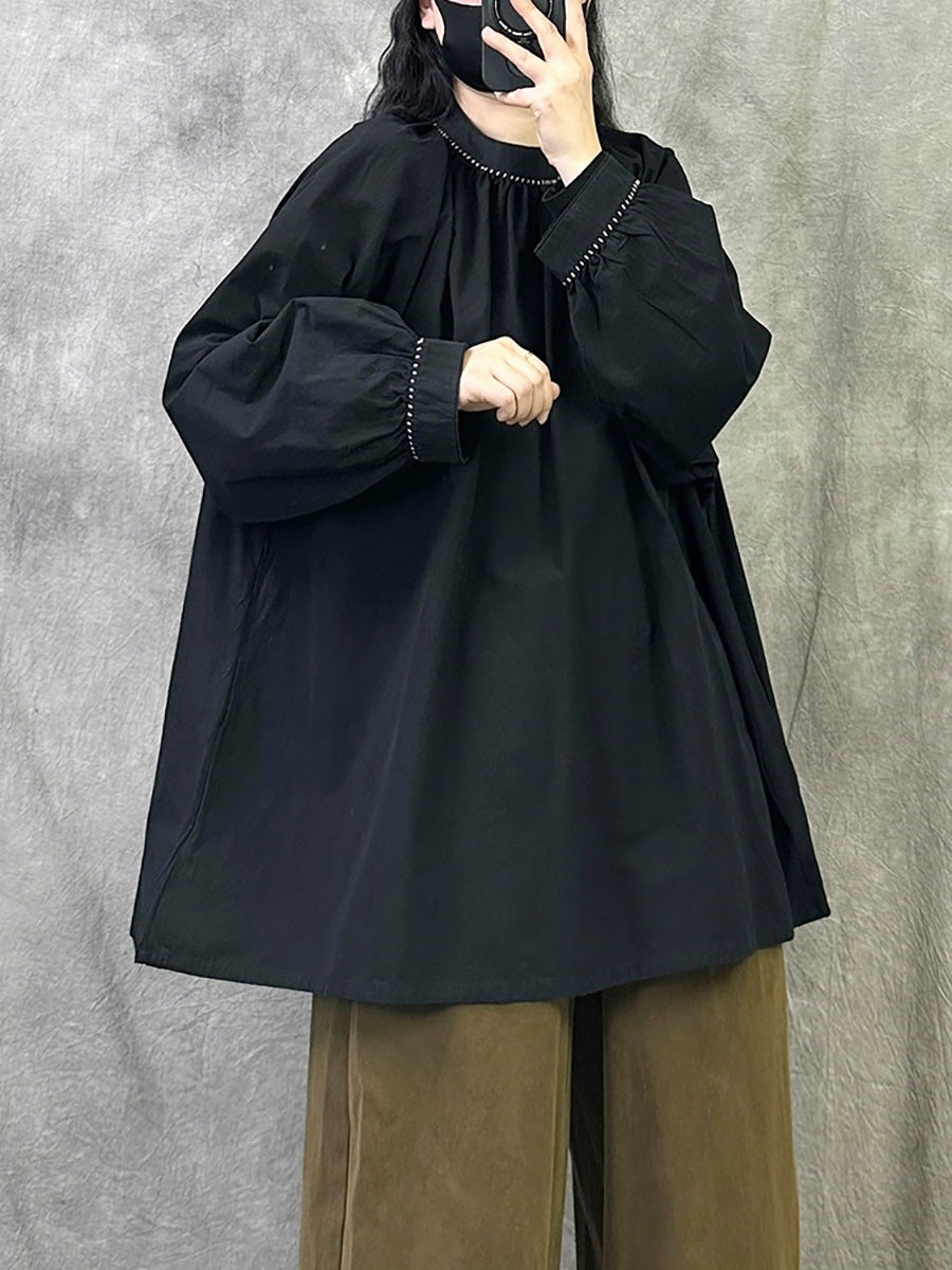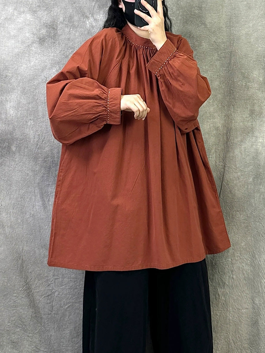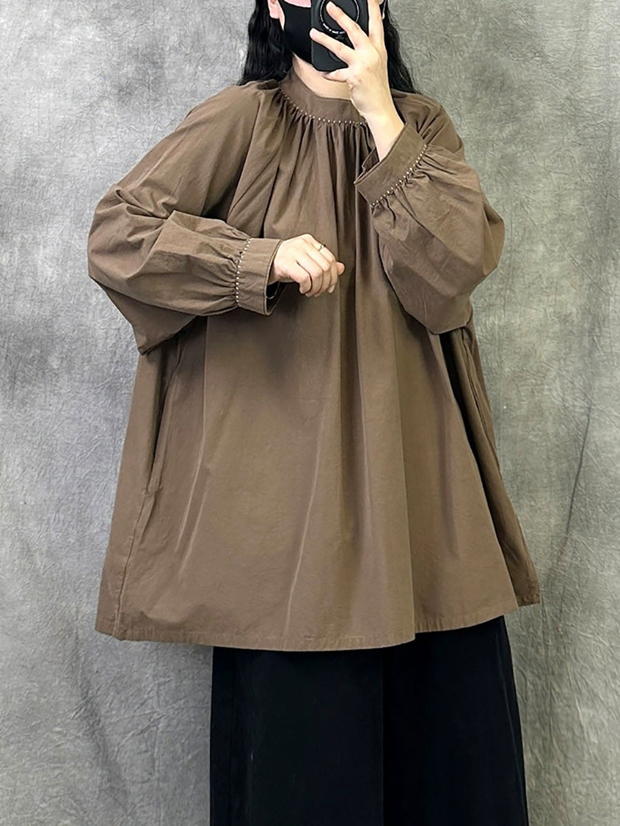 Women Artsy Autumn Pure Color Stand Collar Blouse