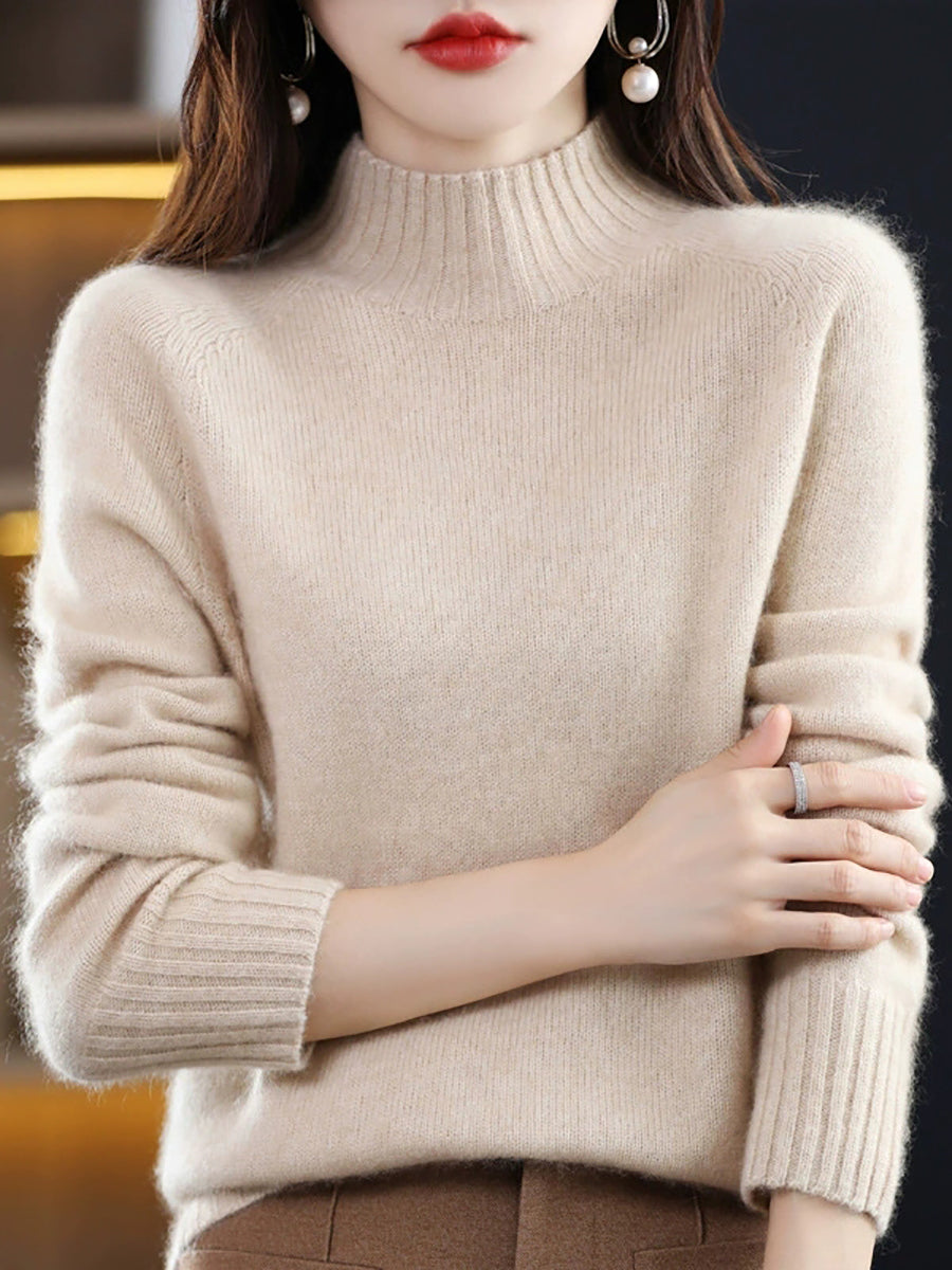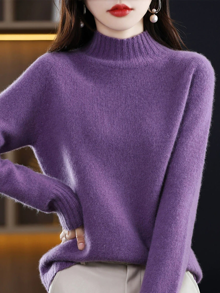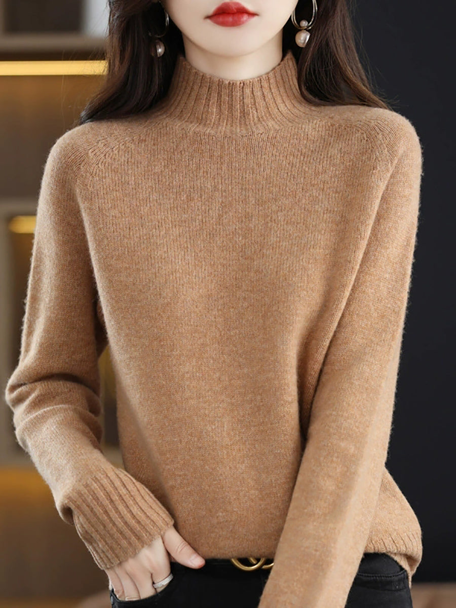 Women Autumn Artsy Pure Color Knitted Half-Turtleneck Sweater