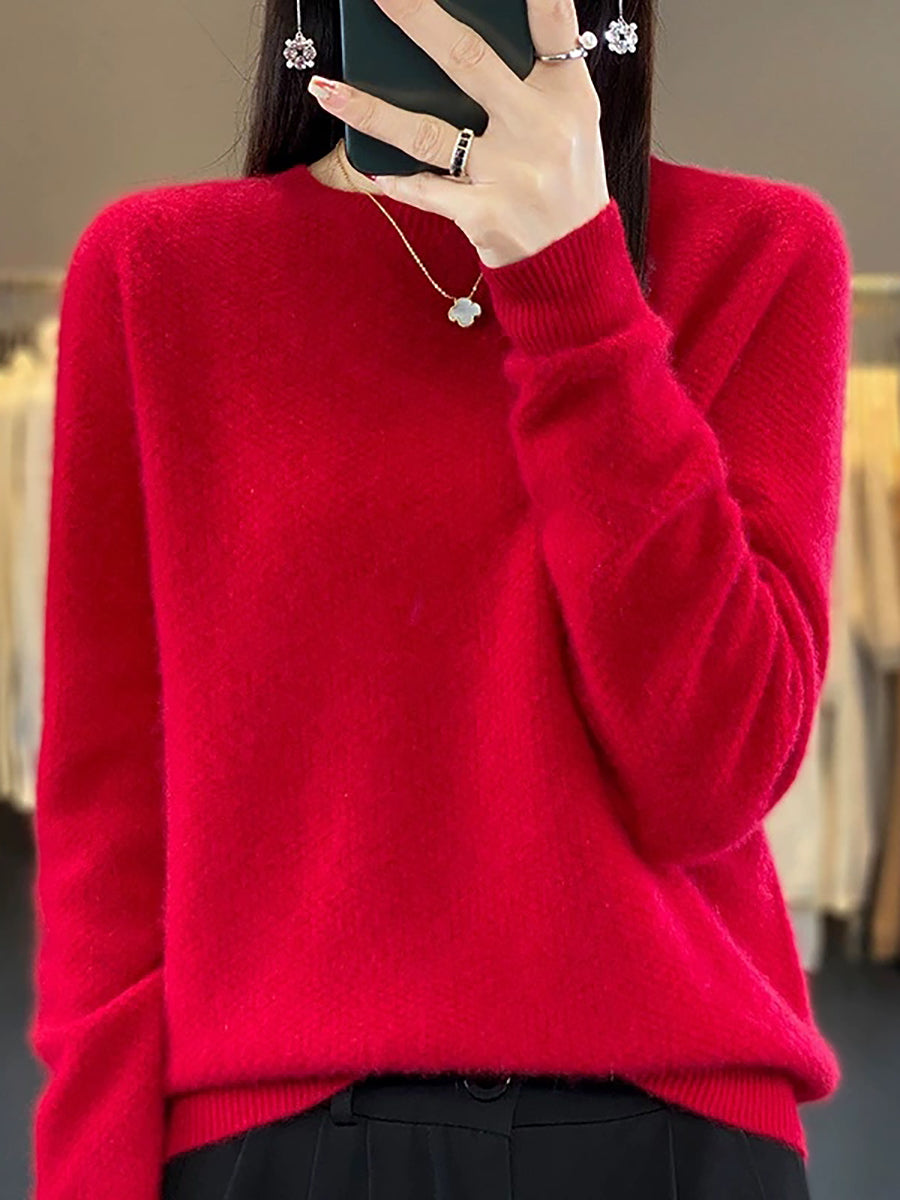 Women Autumn Artsy Pure Color Wool O-Neck Sweater