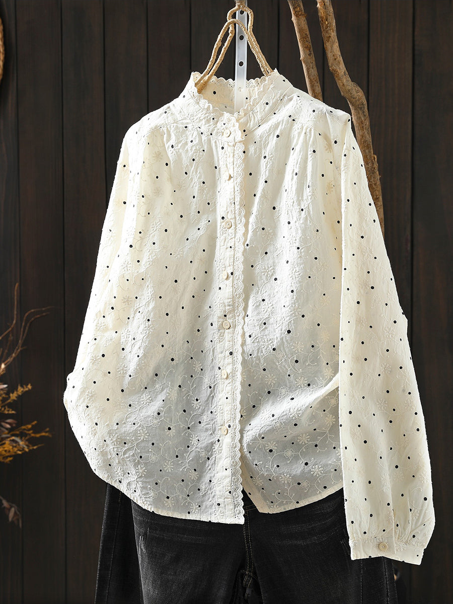 Women Artsy Spring Dot Embroidery 100%Cotton Stand Collar Blouse
