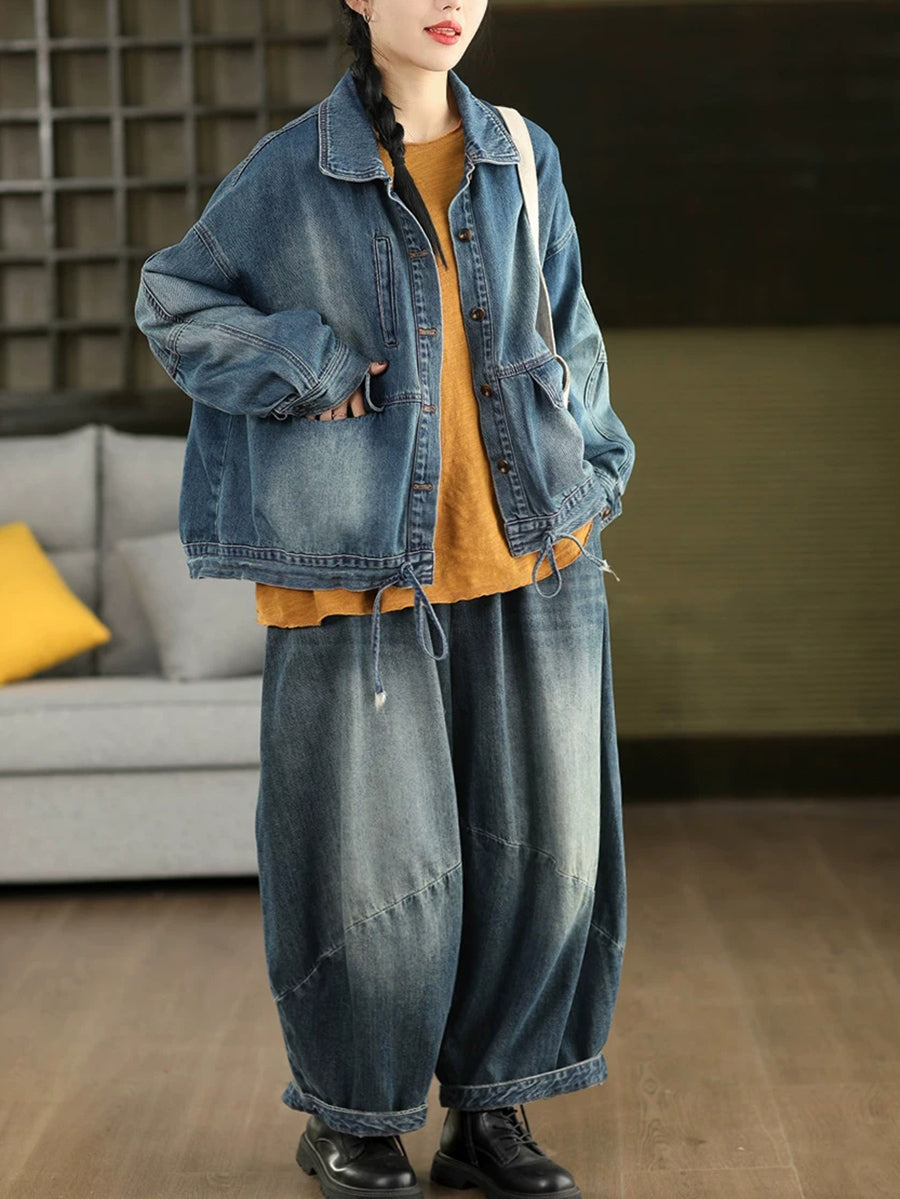 Women Spring Retro Pure Color Denim Coat