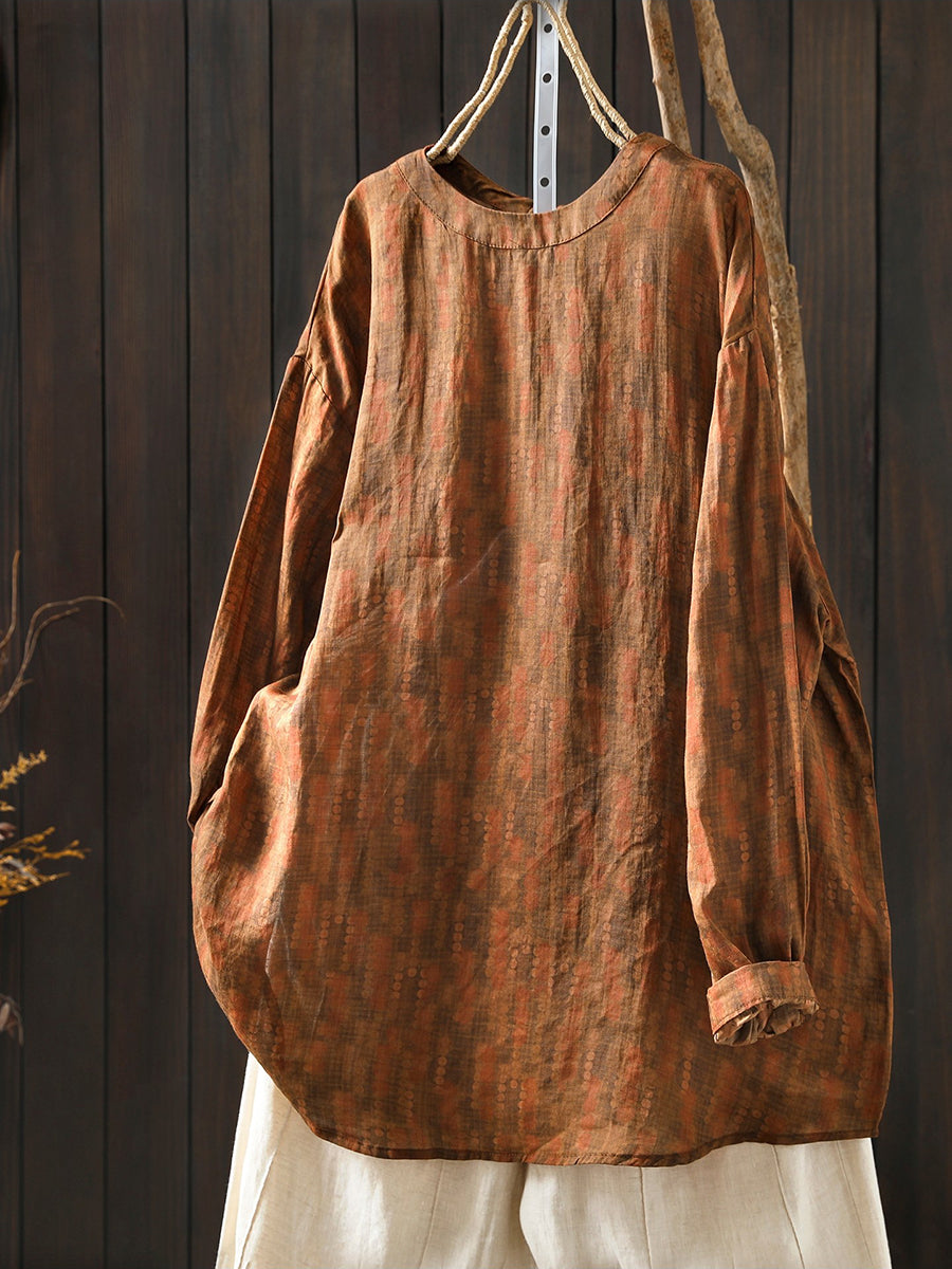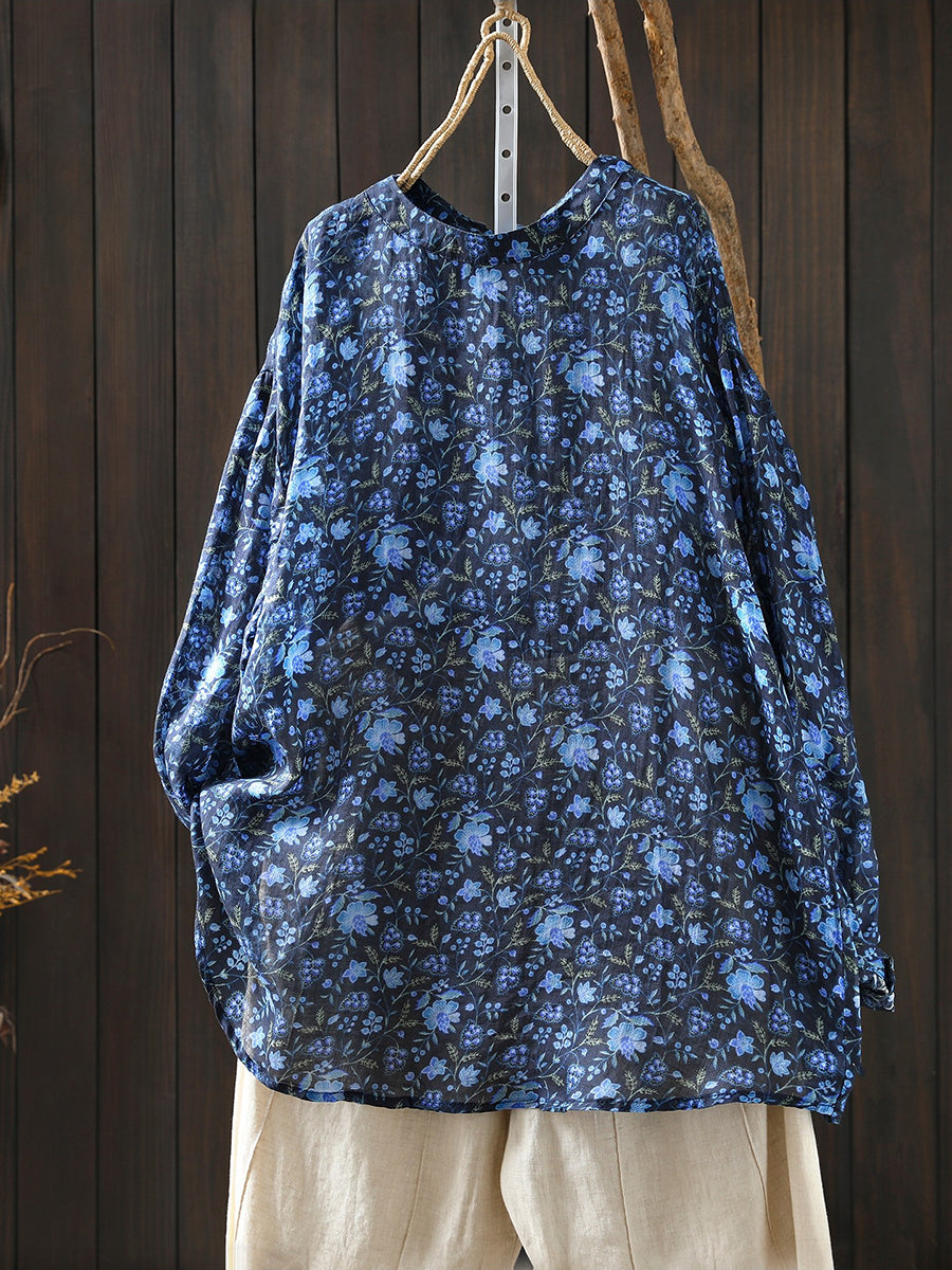 Women Spring Artsy Floral 100%Ramie O-Neck Blouse