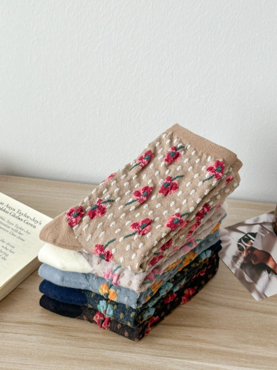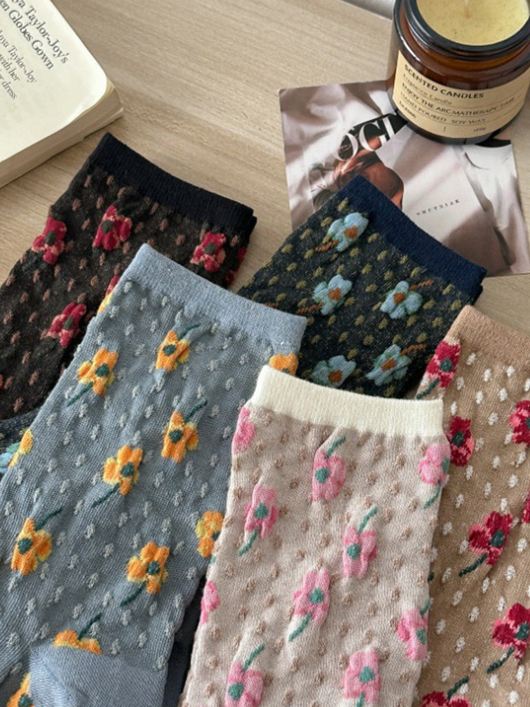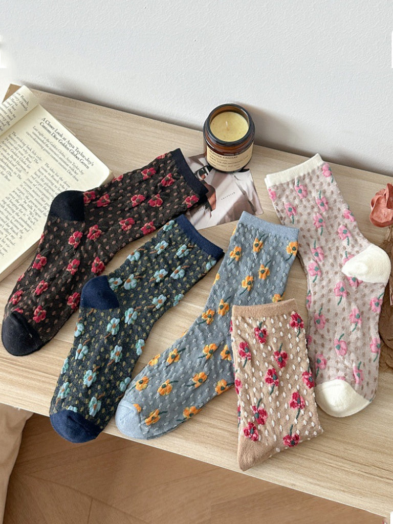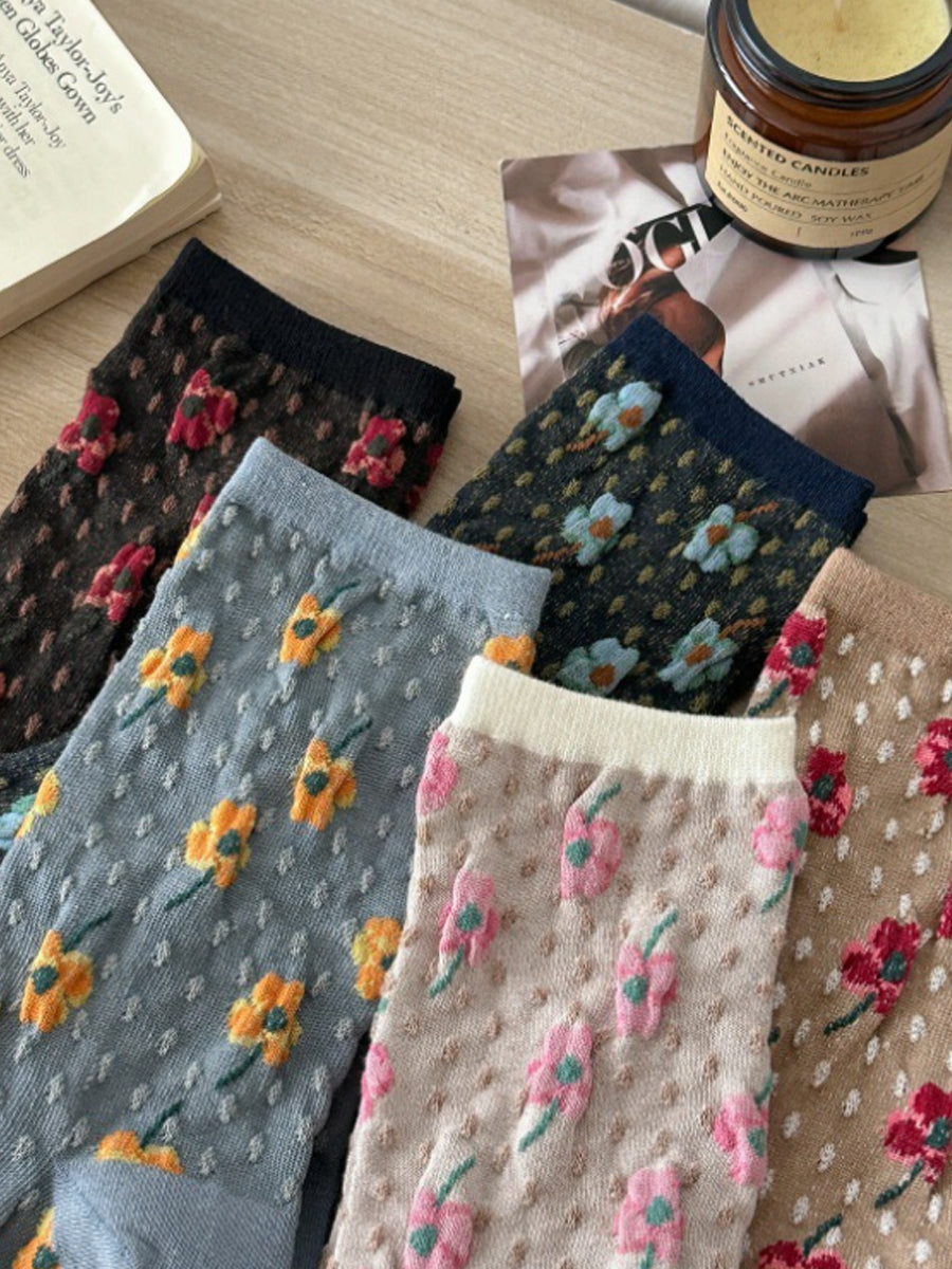 5 Pairs Women Artsy Flower Embossing Cotton Socks