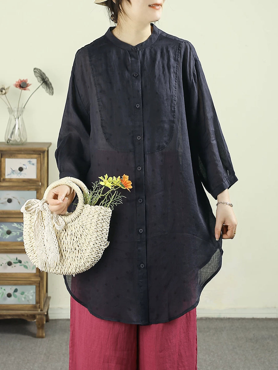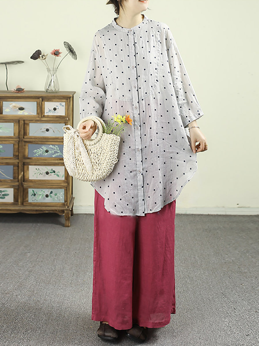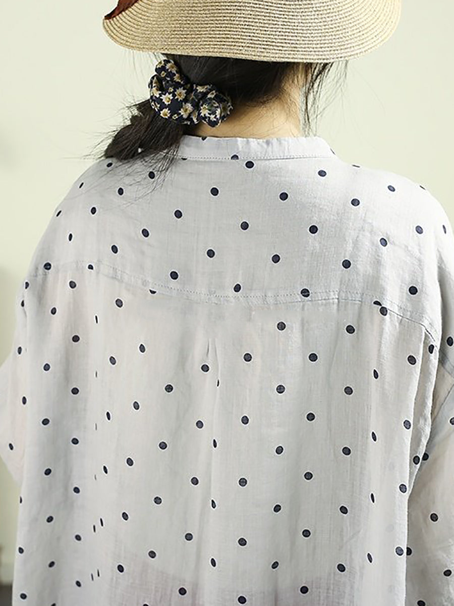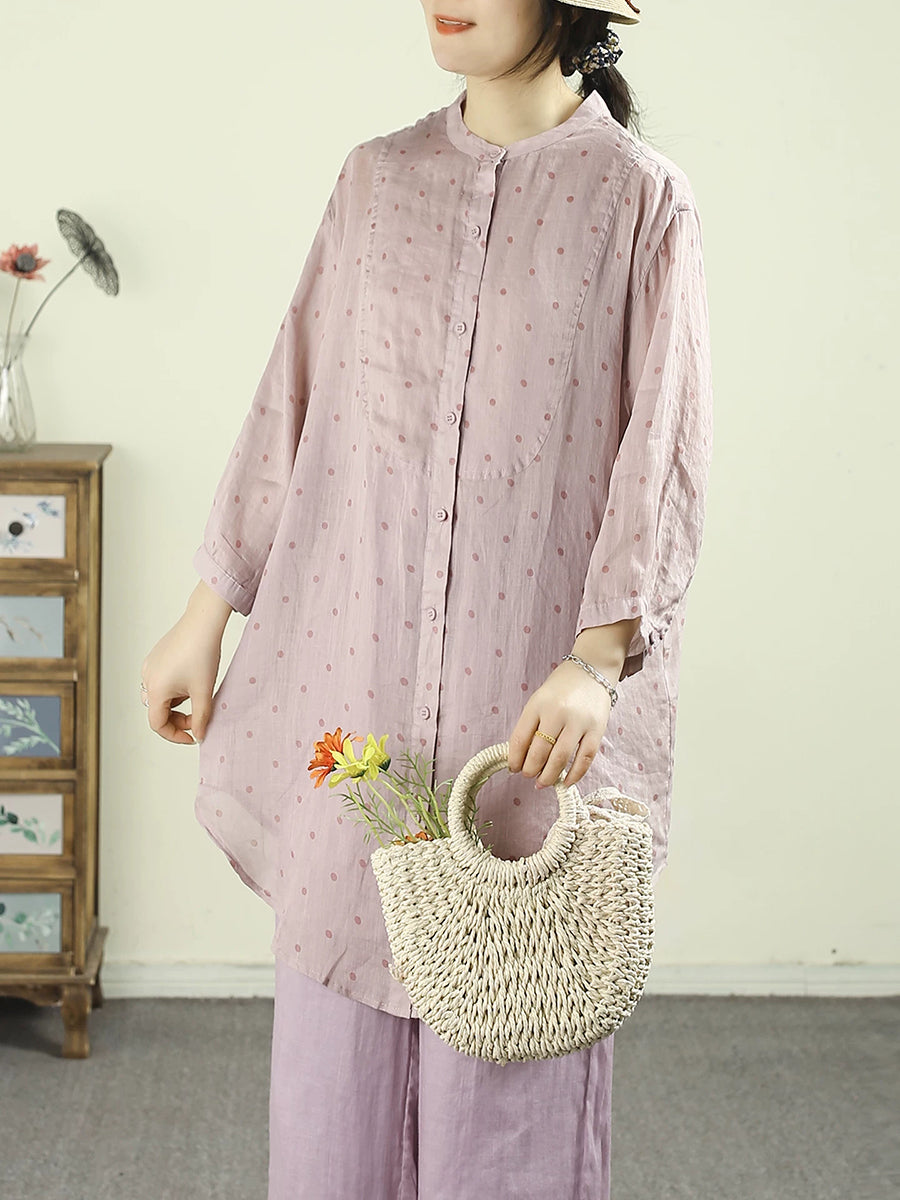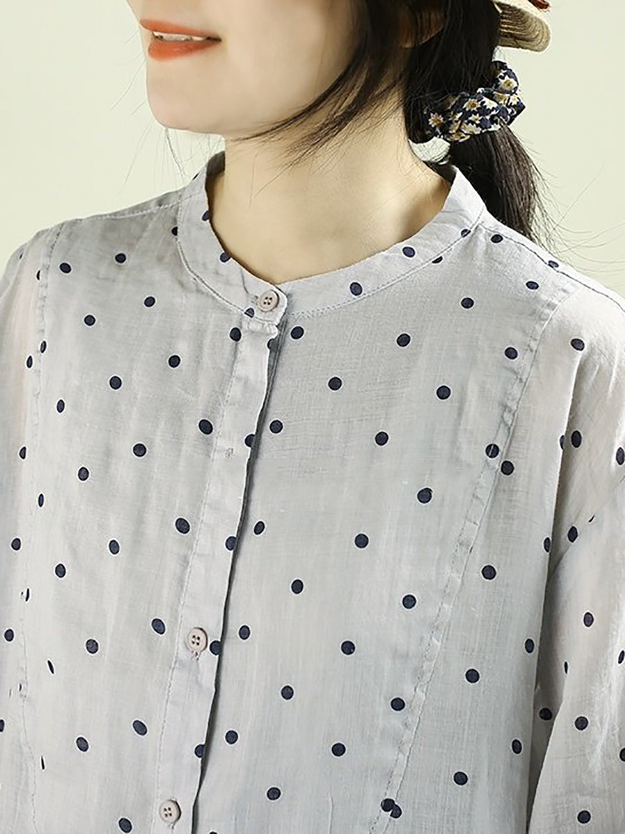 Women Artsy Spring Dot Stand Collar 100%Ramie Blouse