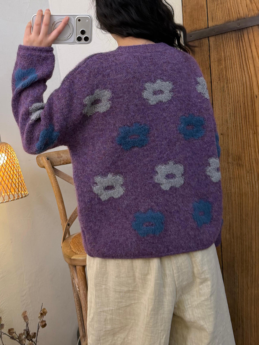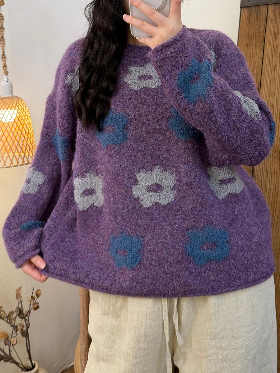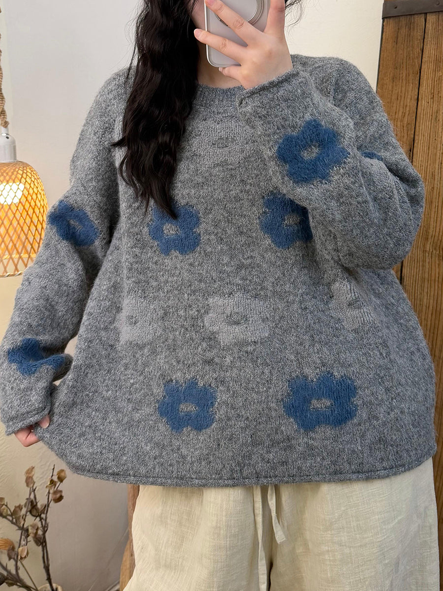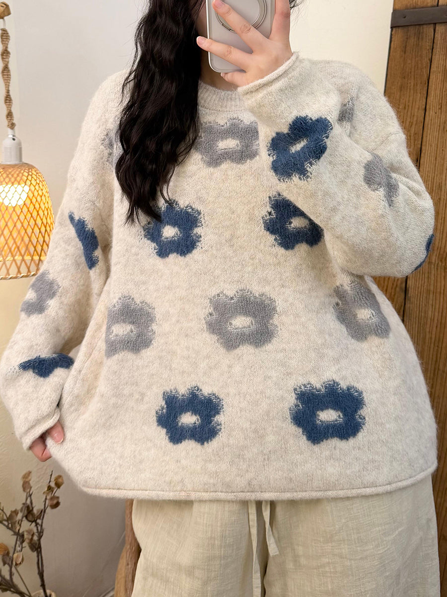 Women Winter Artsy Flower Knitted O-Neck Sweater