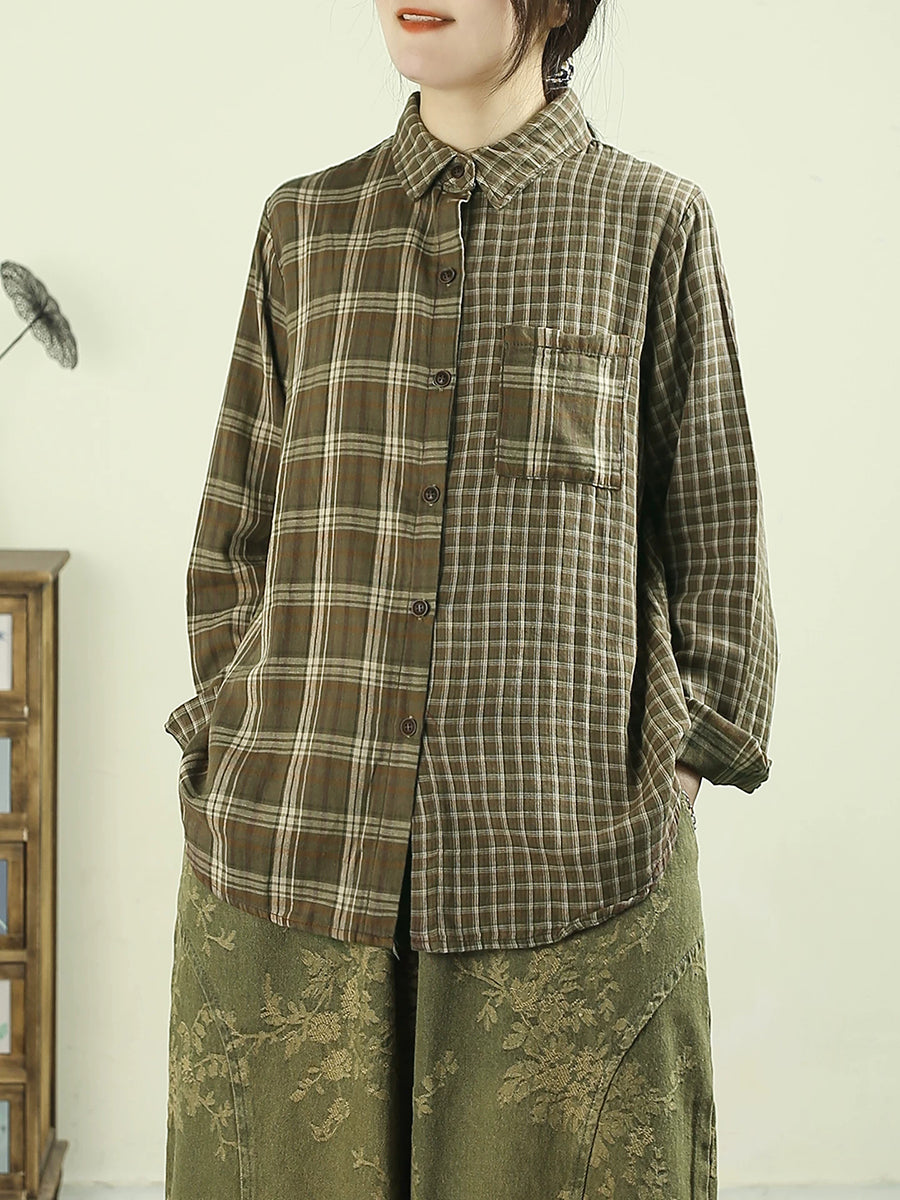 Women Vintage Spring Plaid Turn-down Collar 100%Cotton Shirt