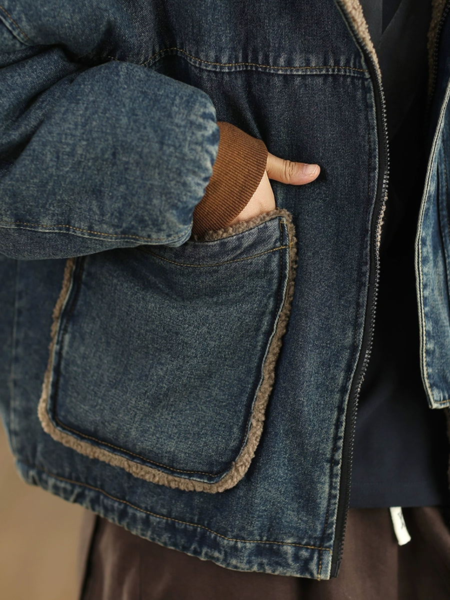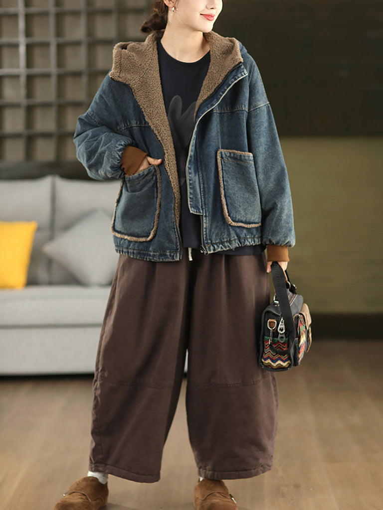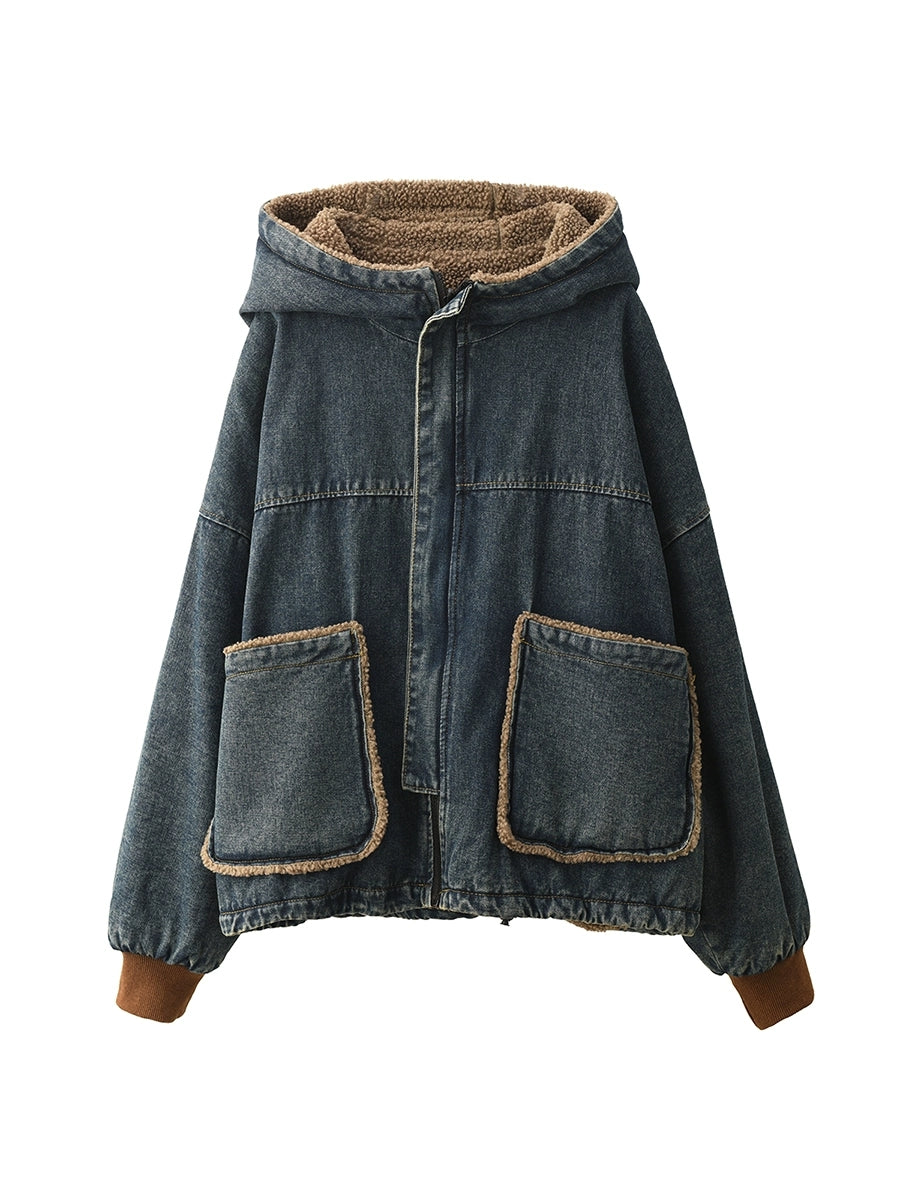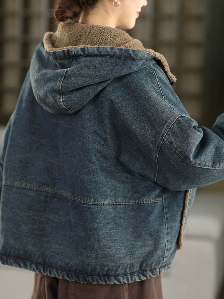 Women Winter Dual-side Wearing Fleece Denim Hooded Coat