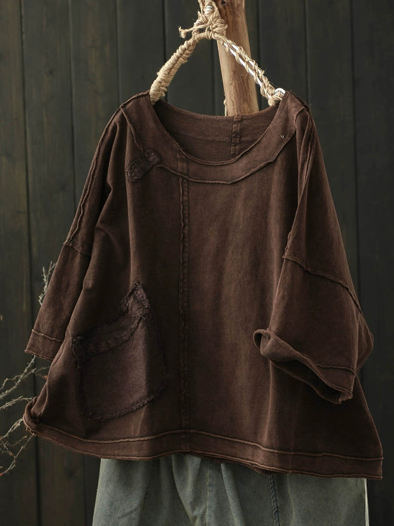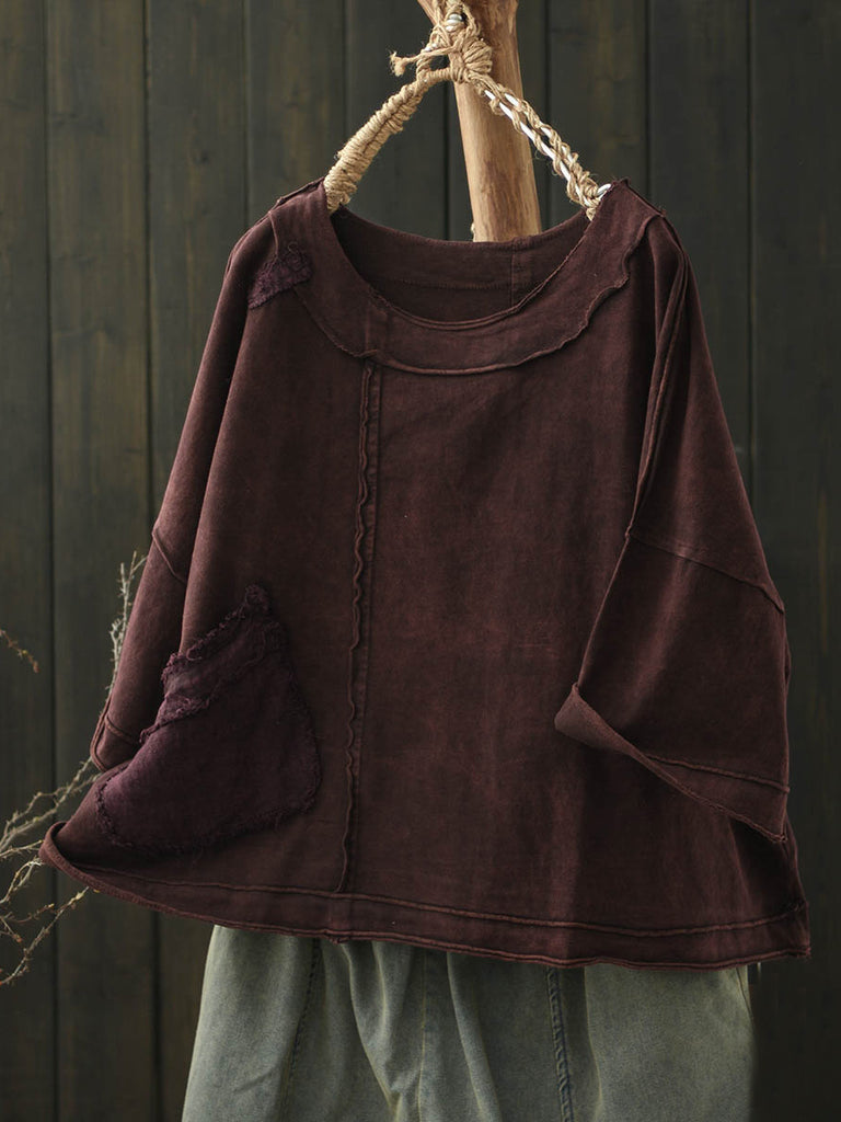 Plus Size Women Autumn Retro Pure Color Cotton Spliced O-Neck Shirt
