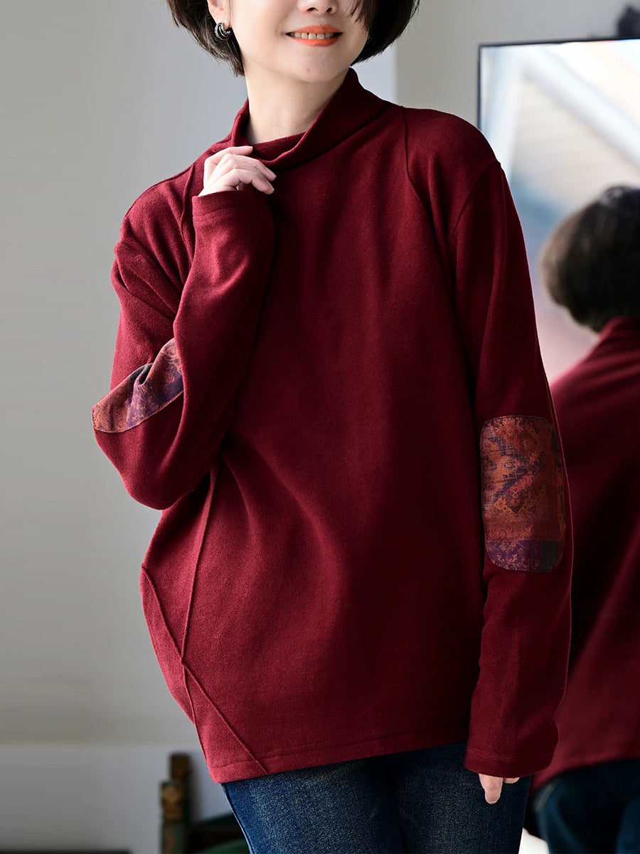 Women Spring Retro Patch Cotton Turtleneck Blouse