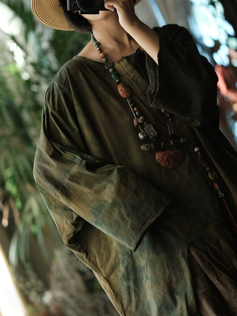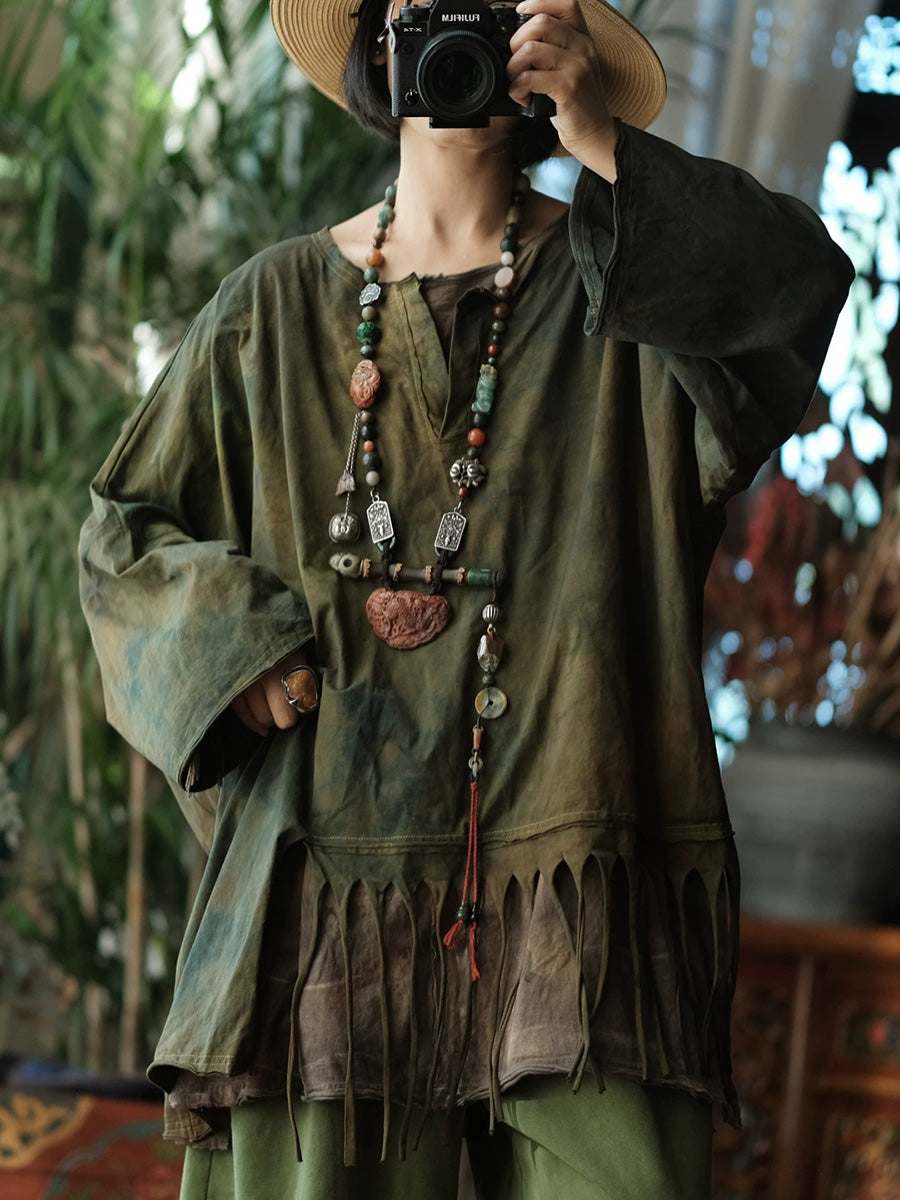 Women Spring Retro Tie-dye Tassel Spliced O-Neck Blouse