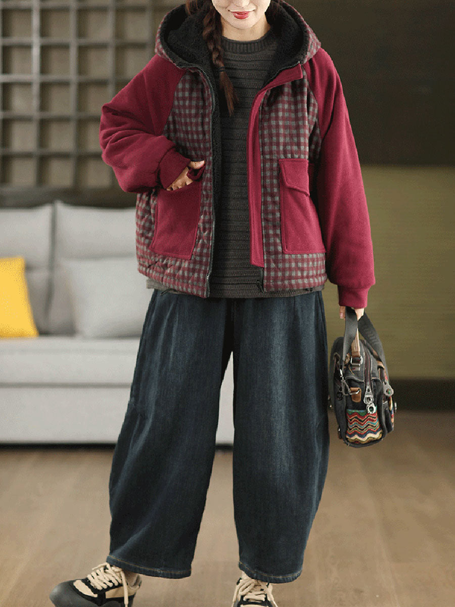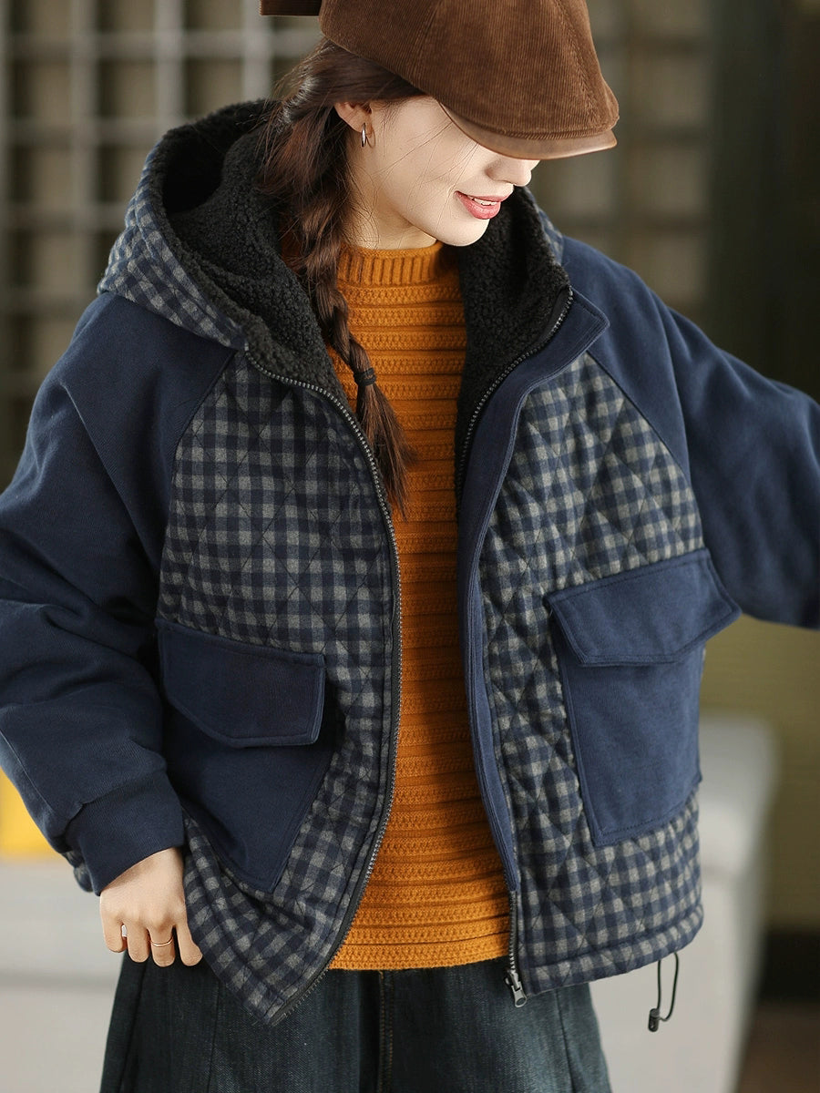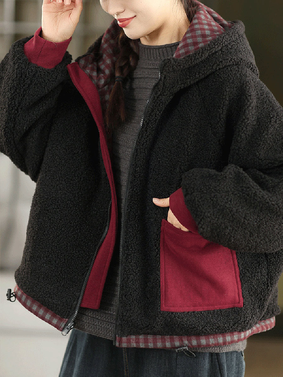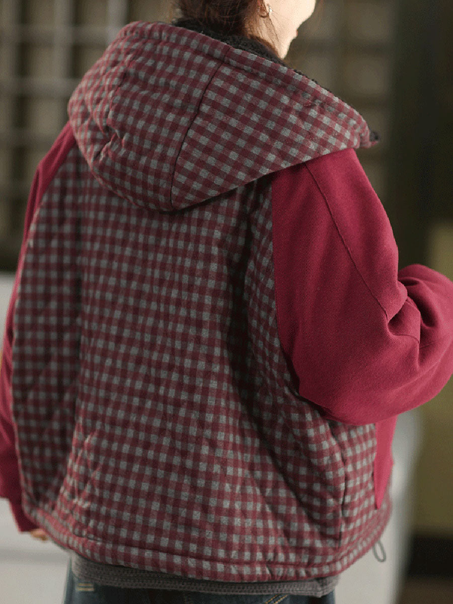 Women Winter Plaid Dual-side Wearing Fleece-lined Hooded Coat