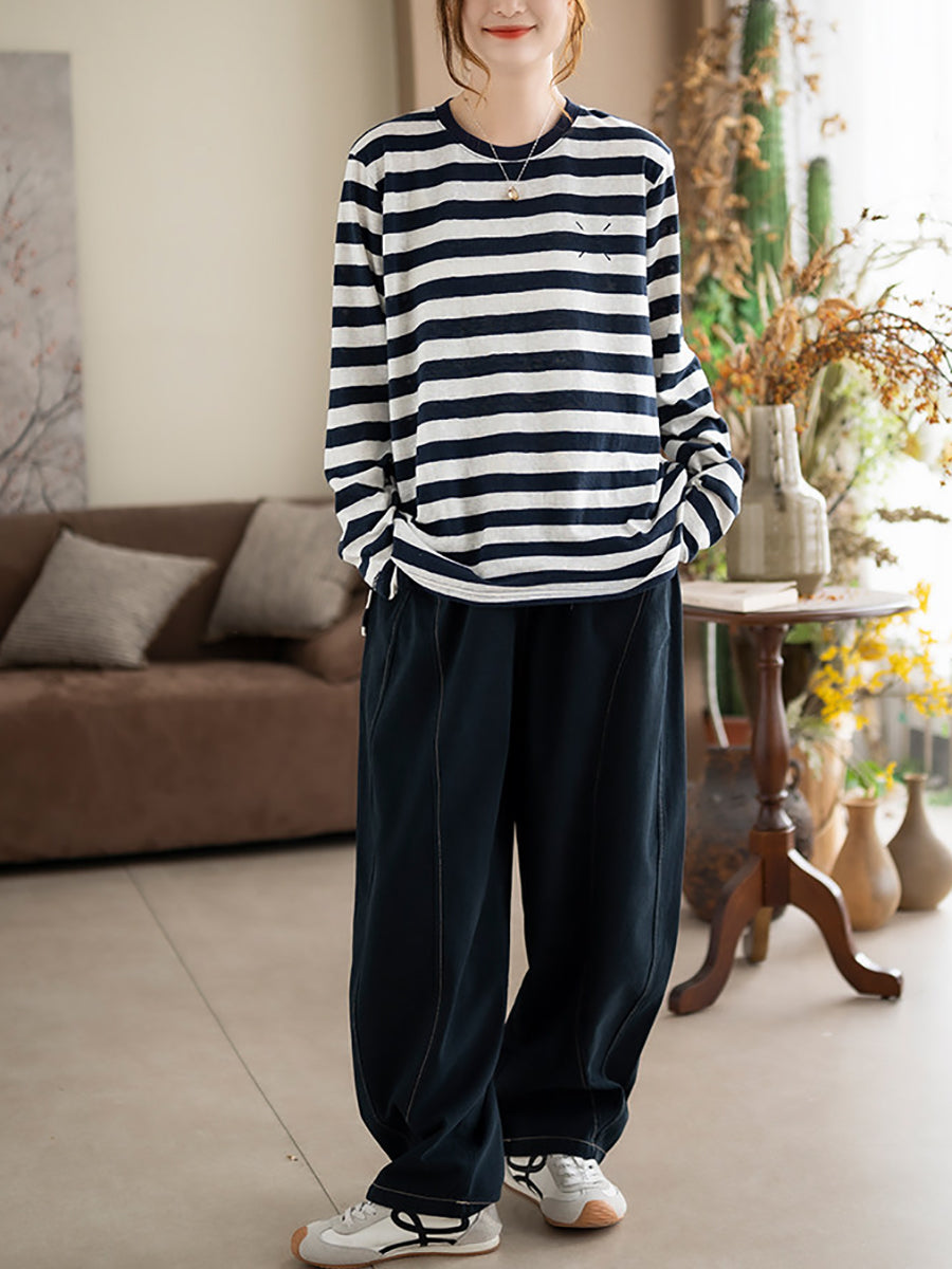 Women Artsy Spring Stripe O-Neck Cotton Blouse