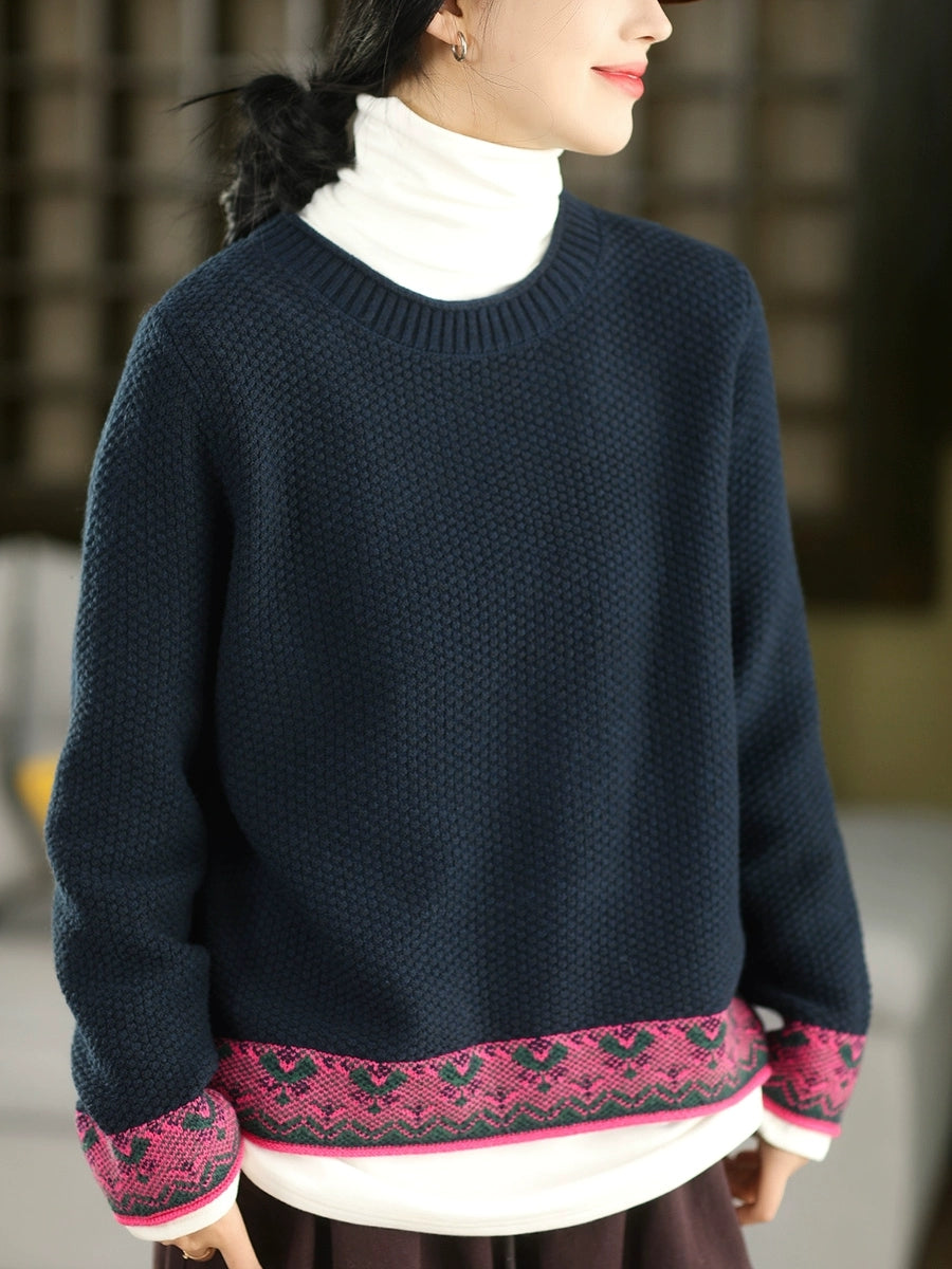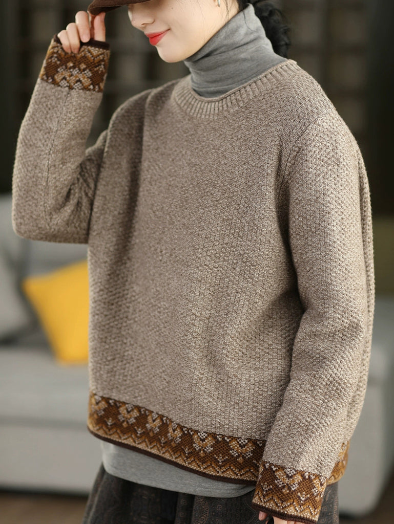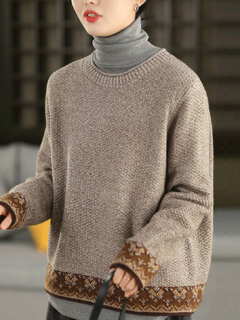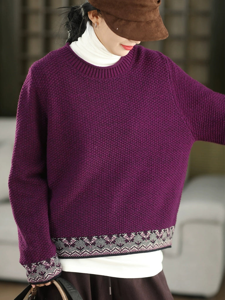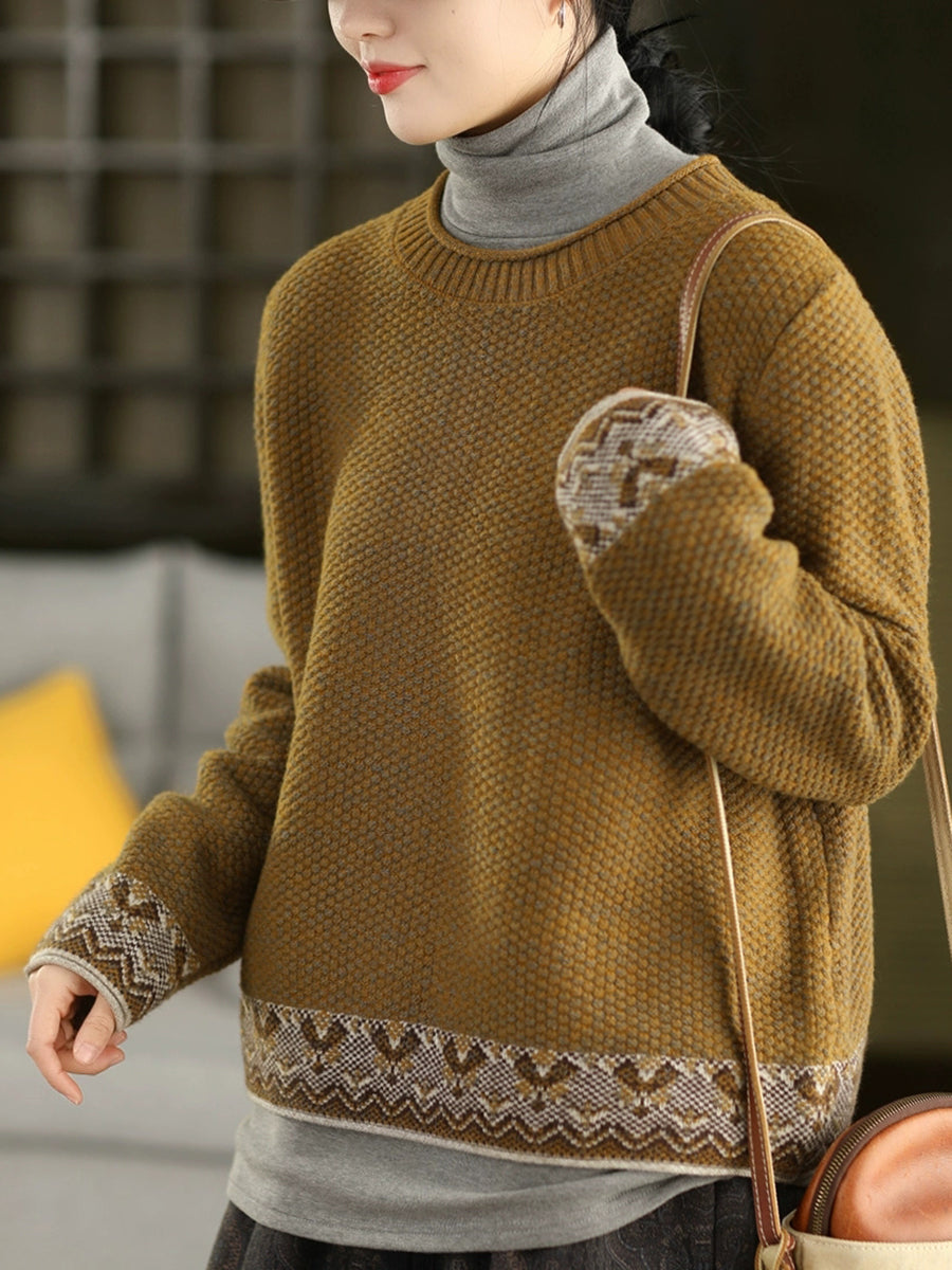 Women Autumn Ethnic Jacquard O-Neck Sweater
