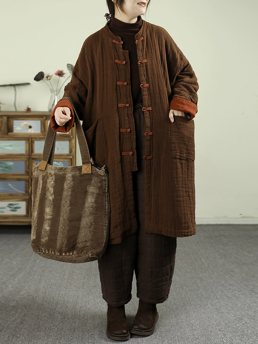 Women Vintage Winter 100%Linen Stand Collar Coat