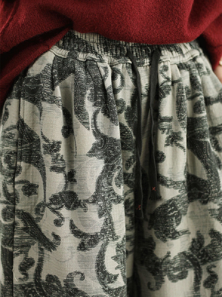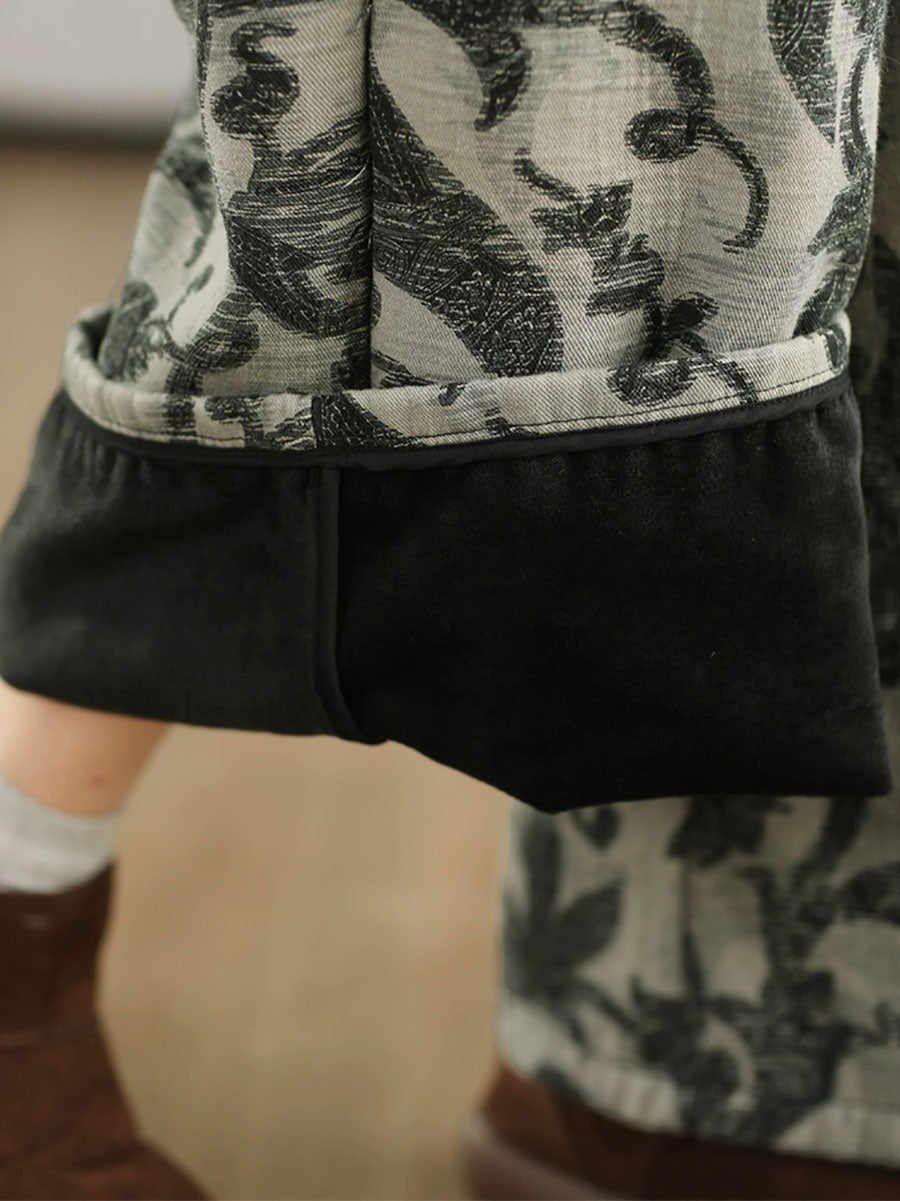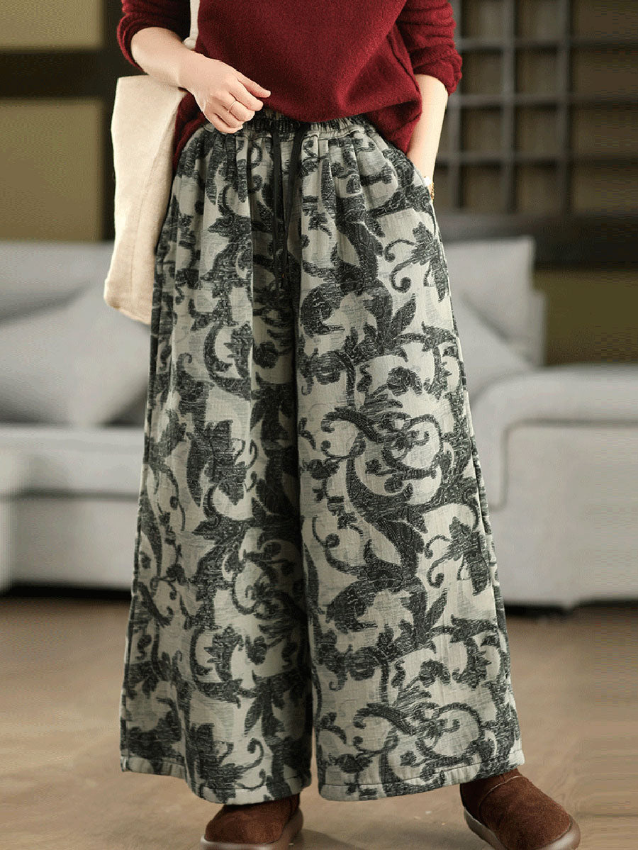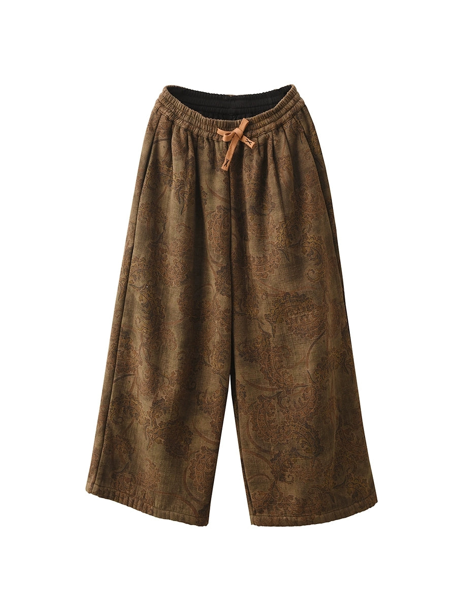 Women Winter Retro Print Fleece-lined 100%Cotton Wide-leg Pants