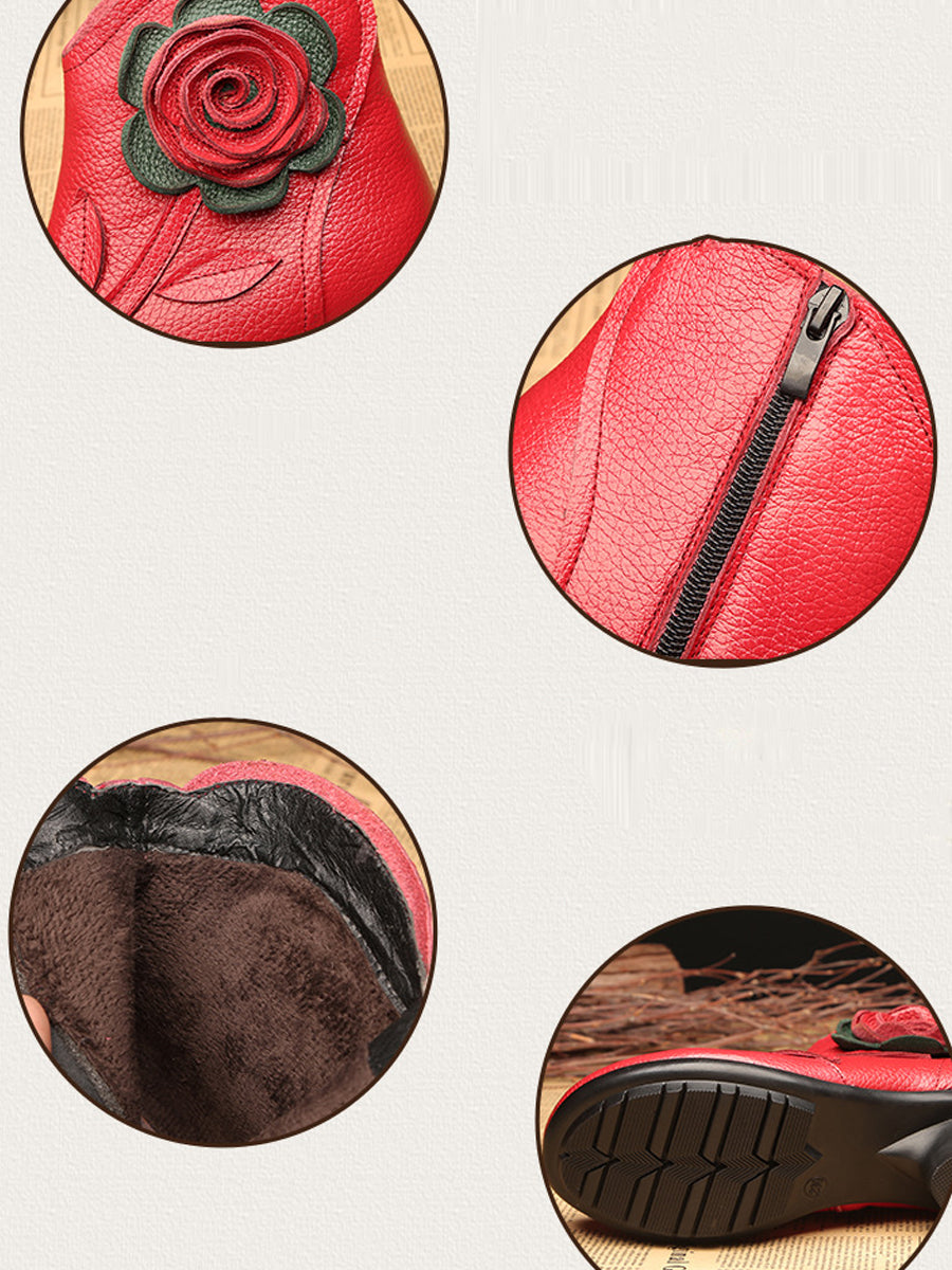 Women Autumn Artsy Flower Leather Spliced Mid Heel Boots