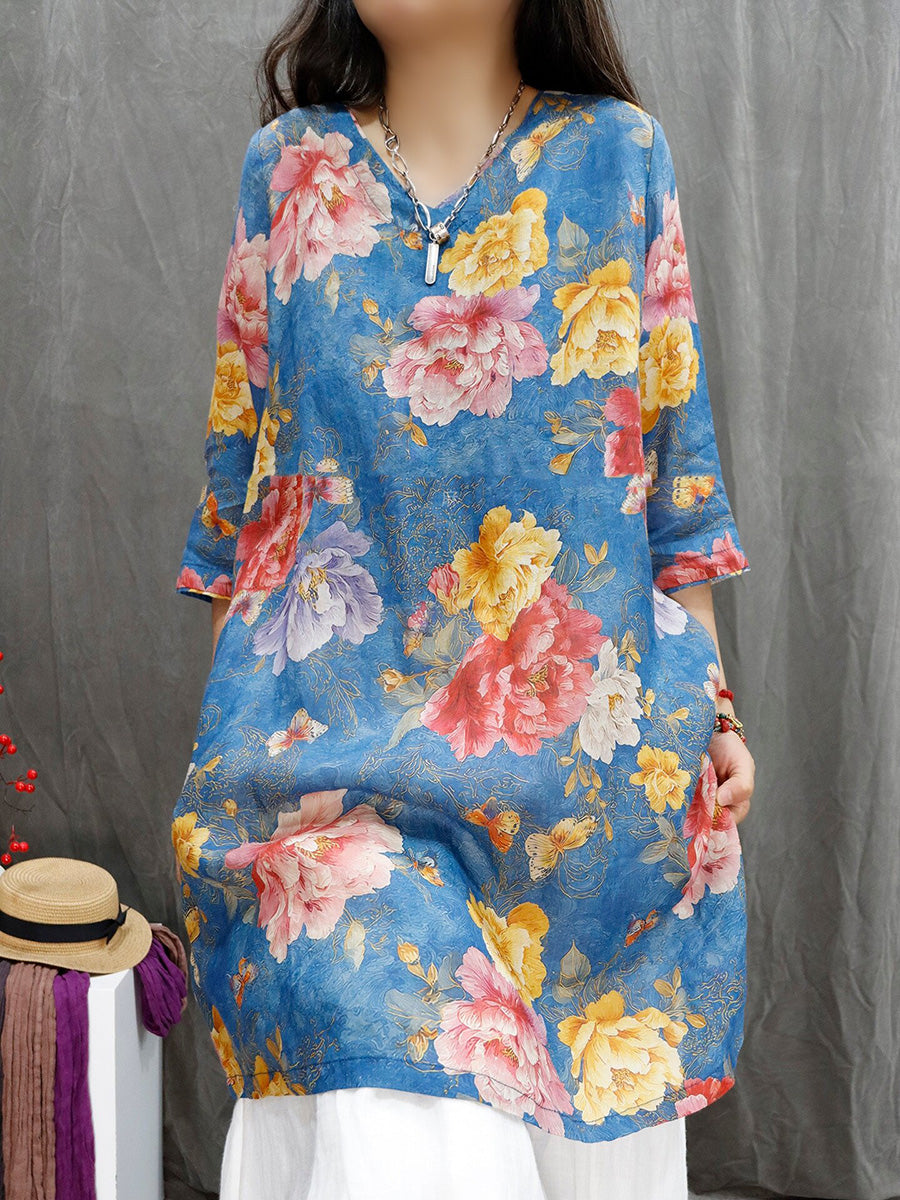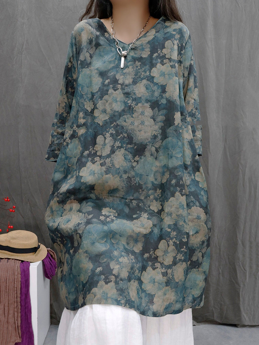 Women Summer Artsy Flower V-Neck 100%Ramie Shirt