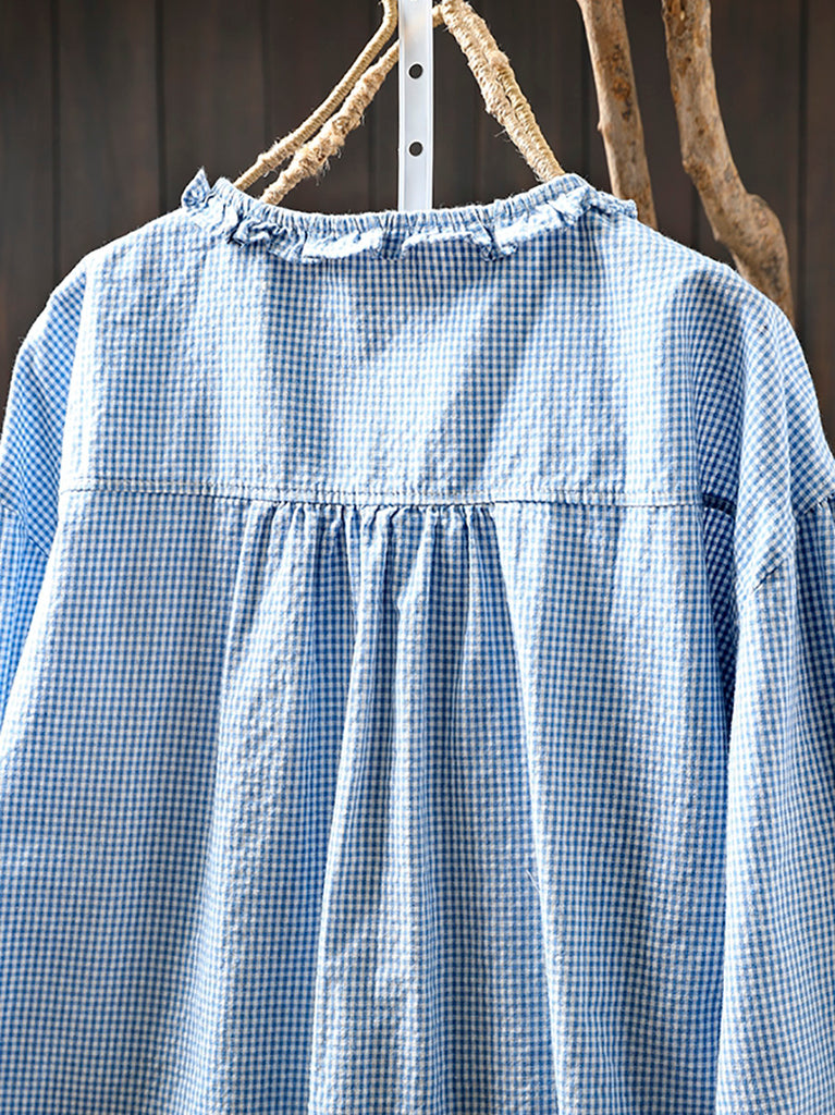 Plus Size Women Summer Artsy Plaid Lace Collar Cotton Shirt