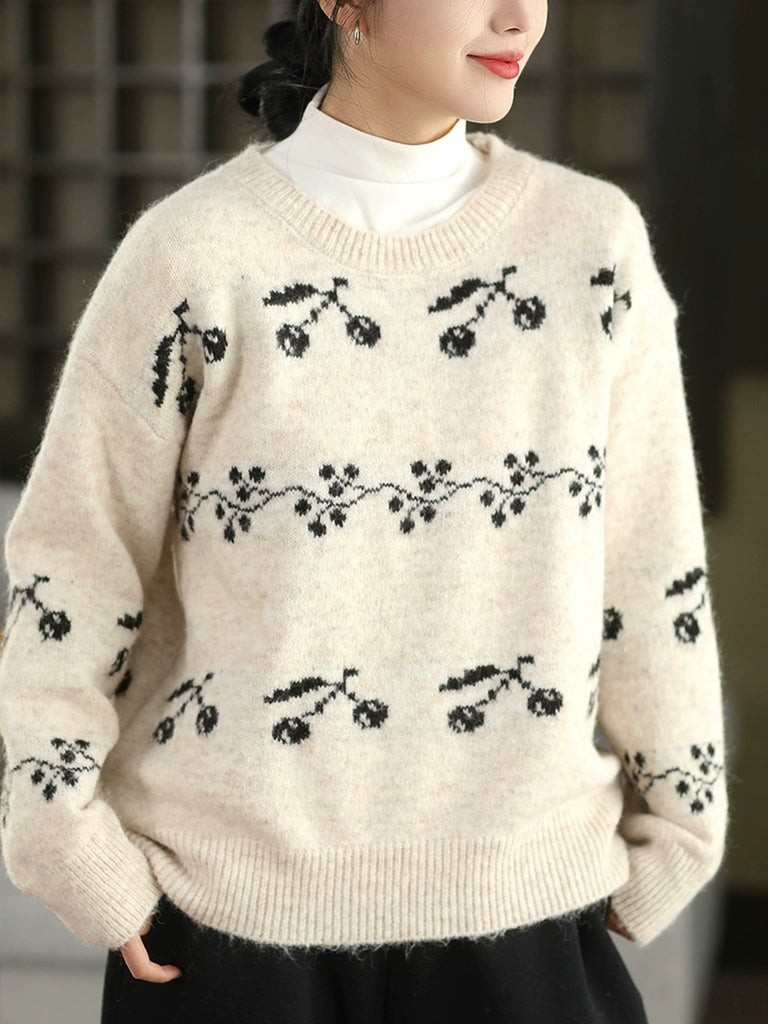 Women Autumn Artsy Cherry Jacquard O-Neck Sweater