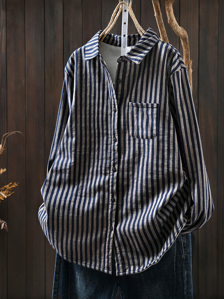 Women Winter Stripe Turn-down Collar 100%Cotton Blouse