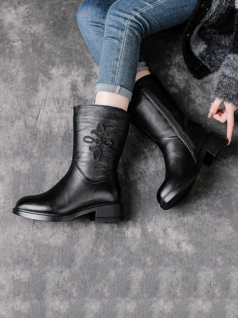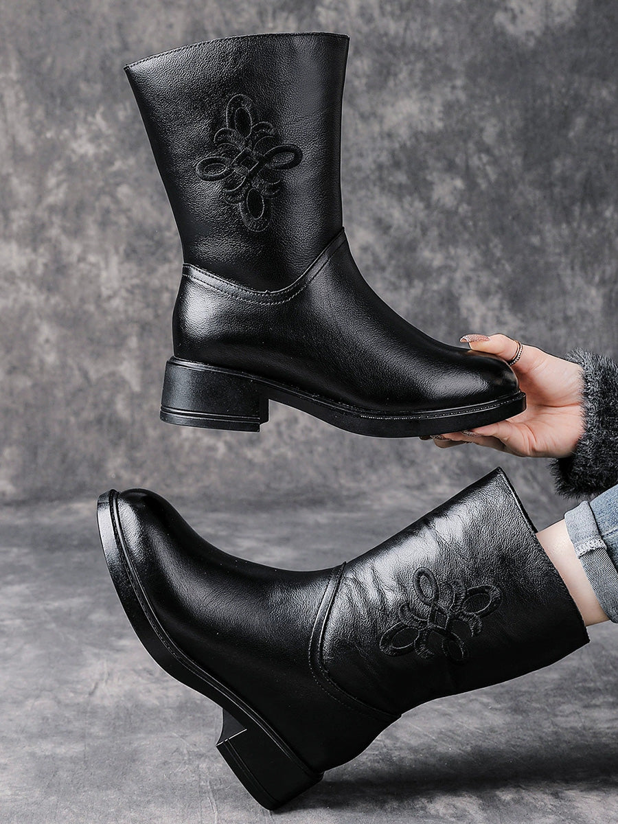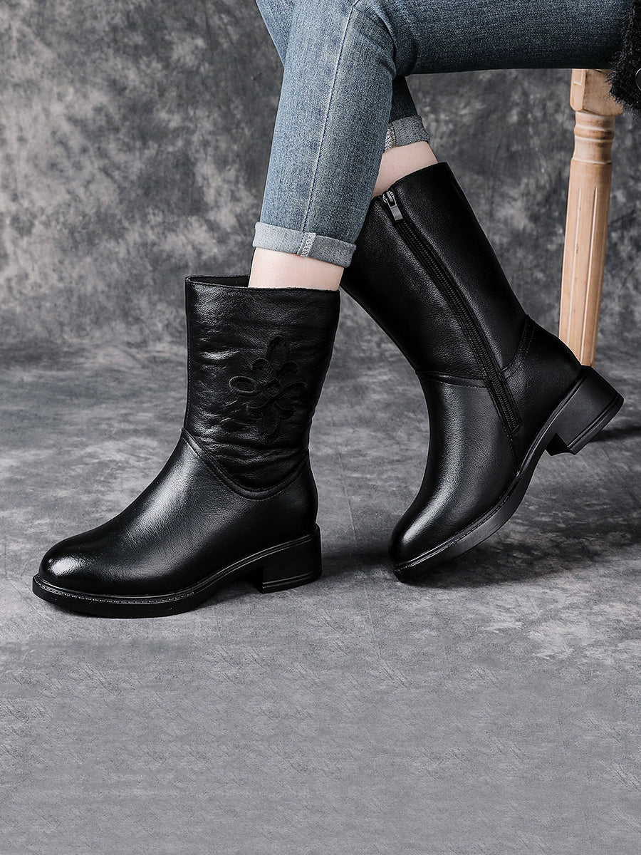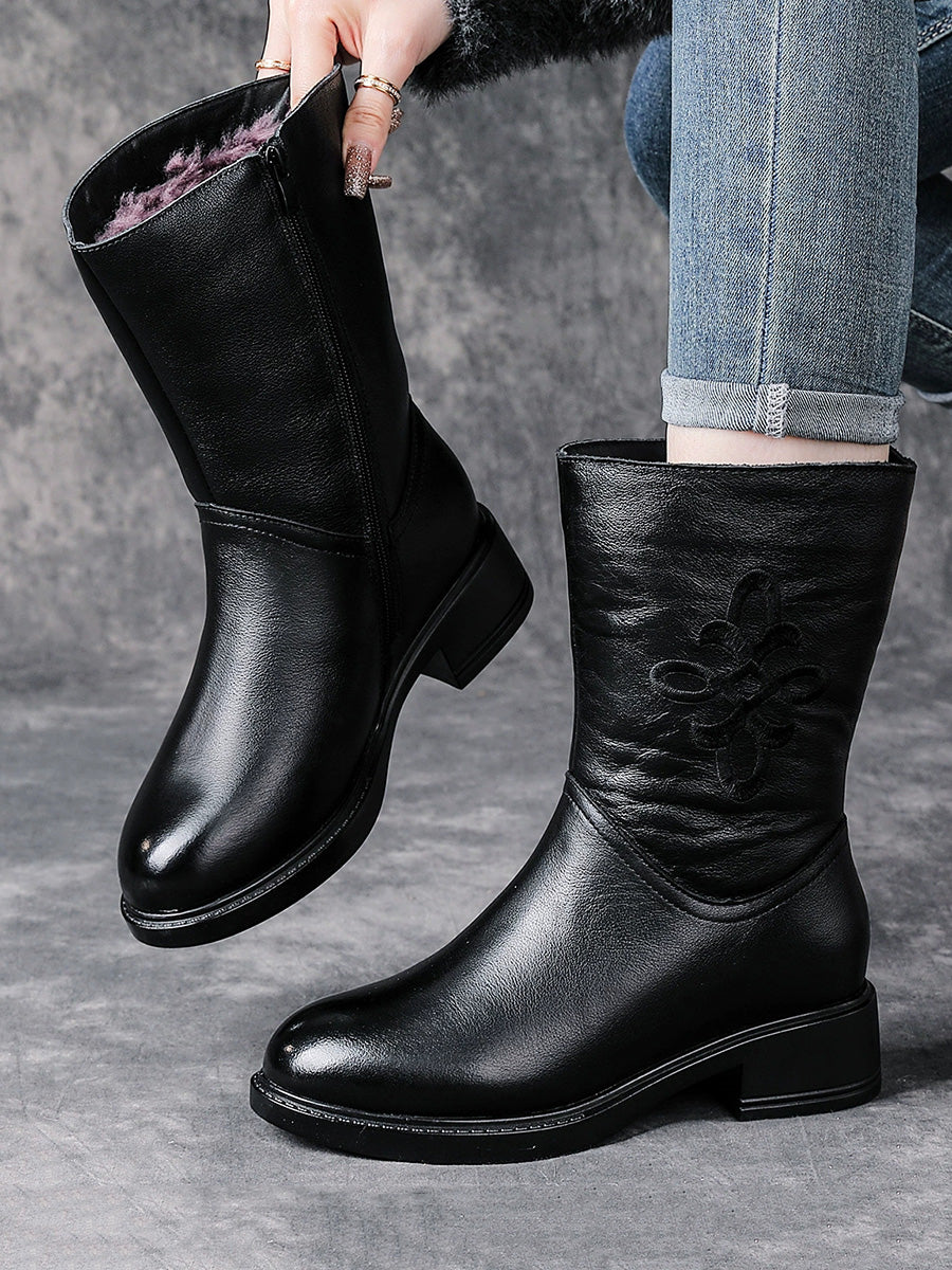 Women Winter Genuine Leather Fleece-lined Mid Heel Boots