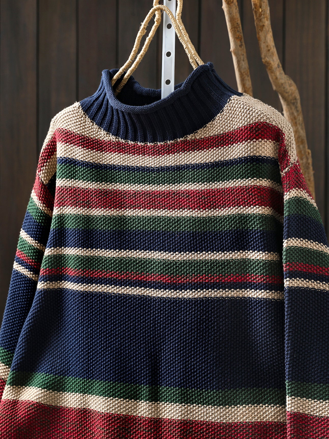 Women Autumn Artsy Colorblock Stripe Half-Turtleneck Sweater