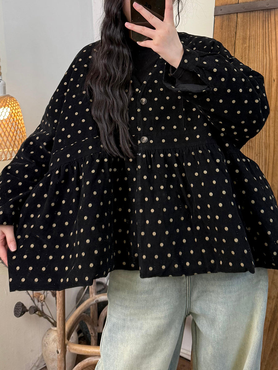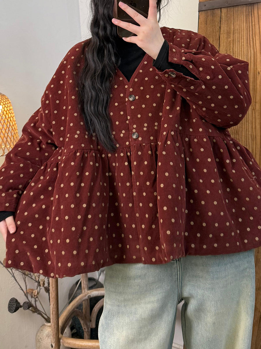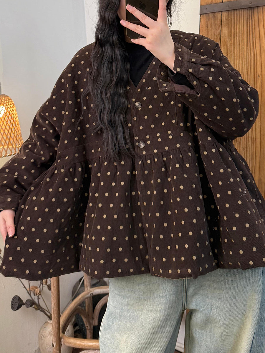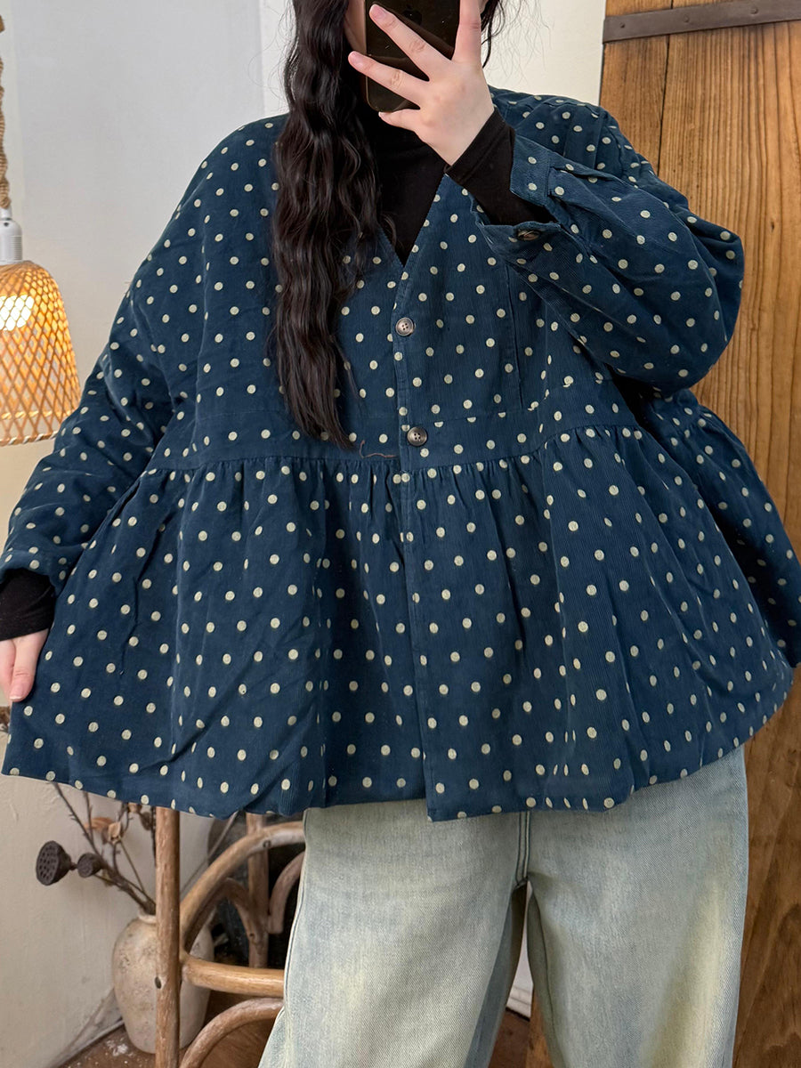 Women Vintage Autumn Dot Cotton V-Neck Padded Coat