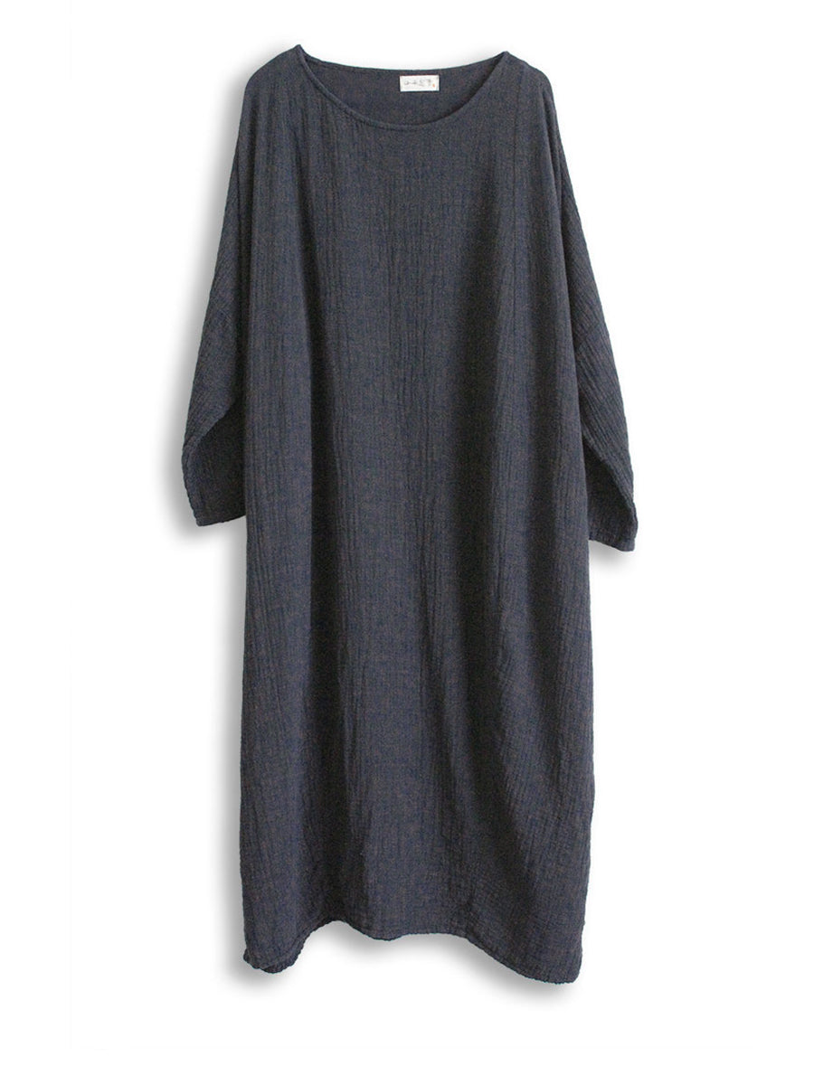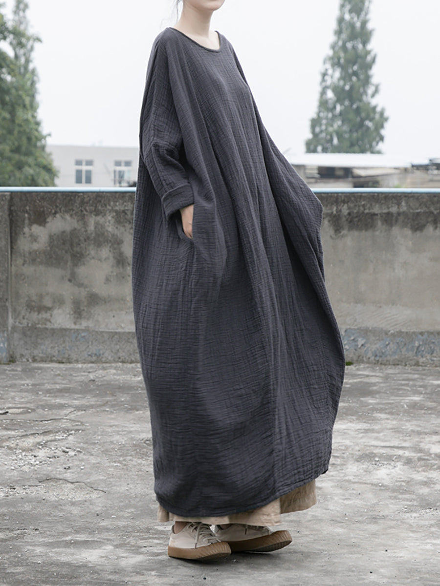 Expertly crafted from a blend of linen and cotton, this dress boasts a timeless solid pattern and features an O-neck collar and full raglan sleeves. The loose and vintage style adds a relaxed yet elegant touch to your wardrobe. Ideal for both spring and autumn, this dress is a must-have for any fashion-forward individual.