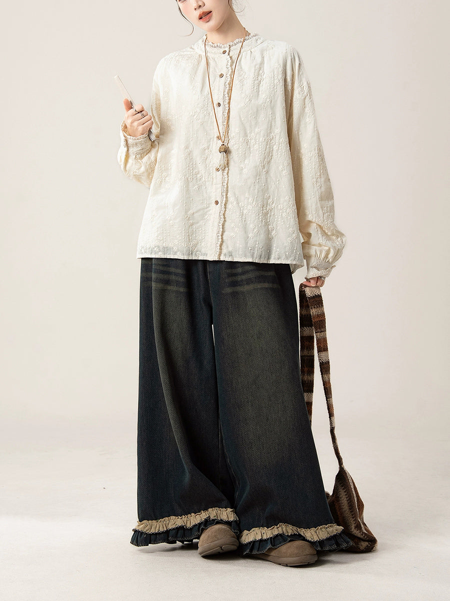 Women Artsy Autumn Embroidery Lace Collar Shirt