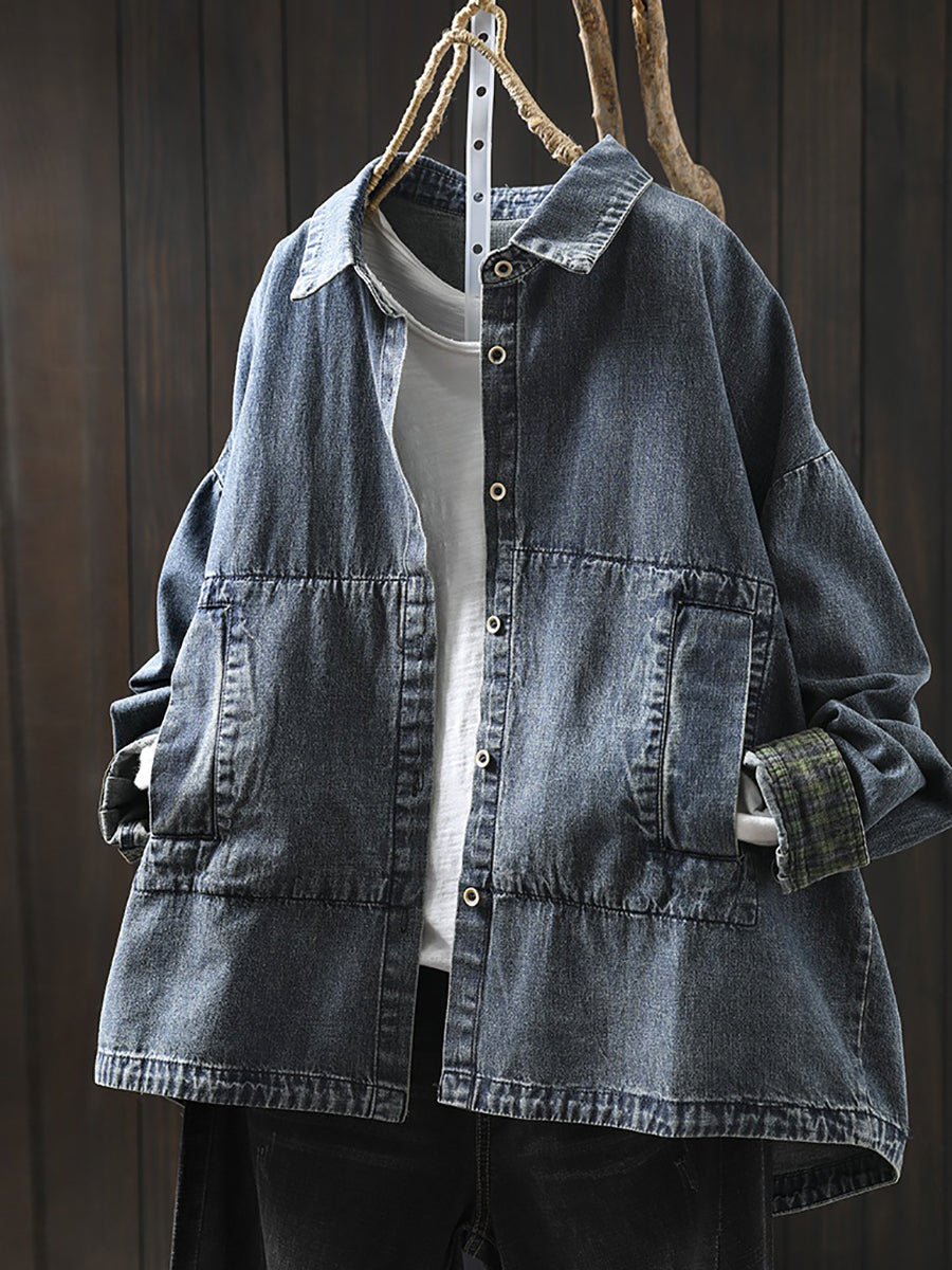 Crafted from denim, this vintage-inspired women's shirt coat features a classic turn-down collar and full raglan sleeves. Designed in a solid color, it perfectly suits the transitional seasons of spring and autumn, combining retro style with practical comfort.