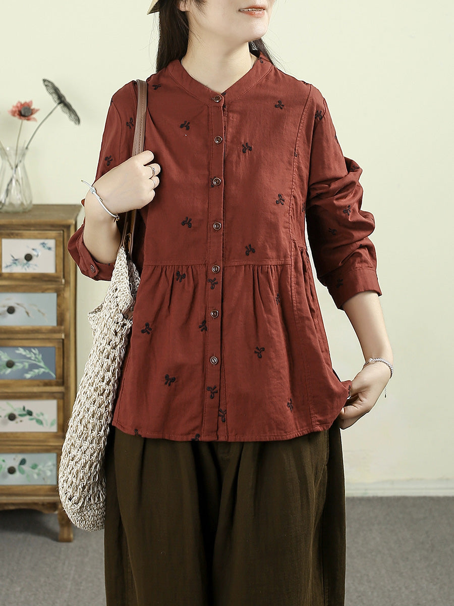 Women Autumn Vintage Embroidery 100%Cotton Stand Collar Shirt