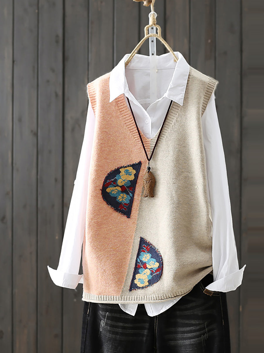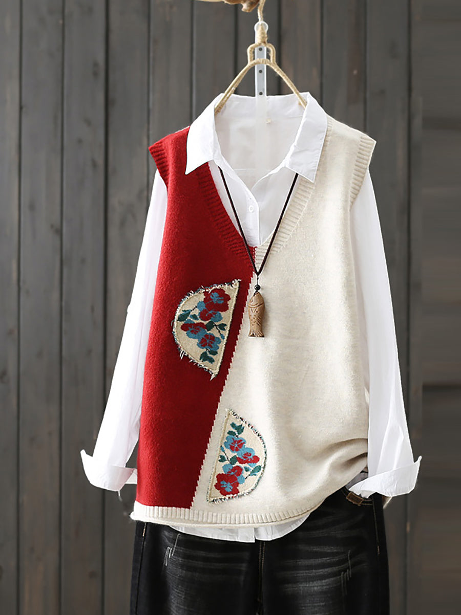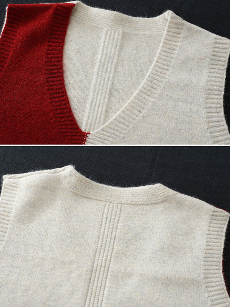 Women Autumn Artsy Colorblock V-Neck Knitted Vest
