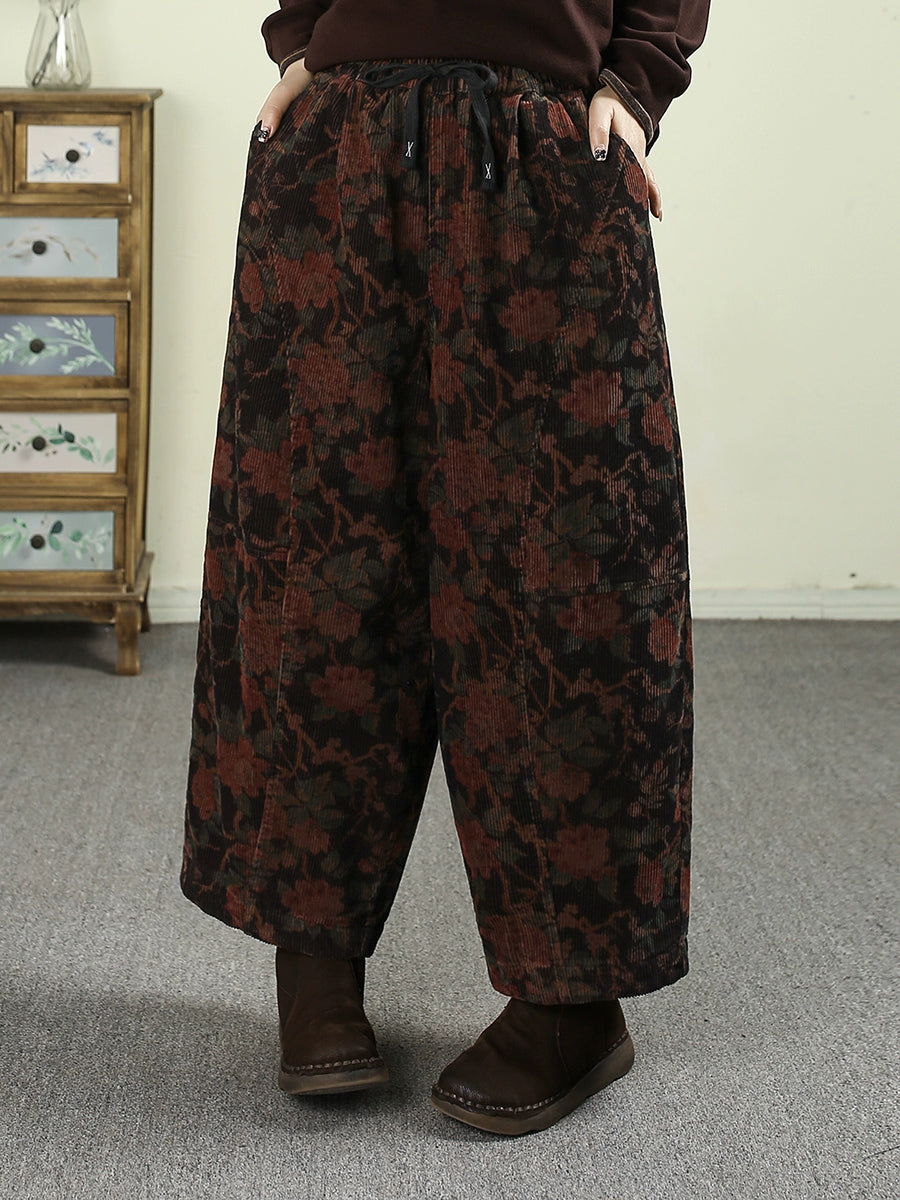 Women Winter Flower Corduroy Padded Wide-leg Pants