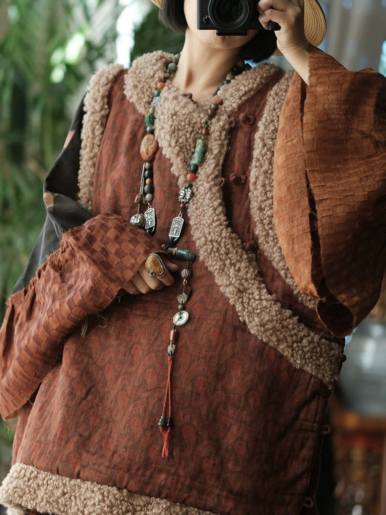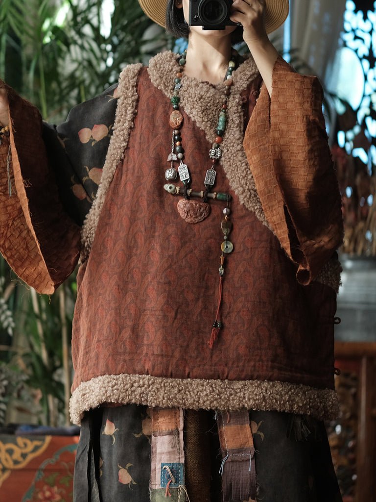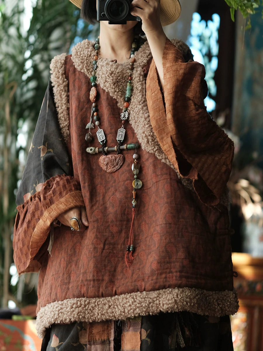 Women Winter Vintage Fleece Spliced O-Neck Padded Vest