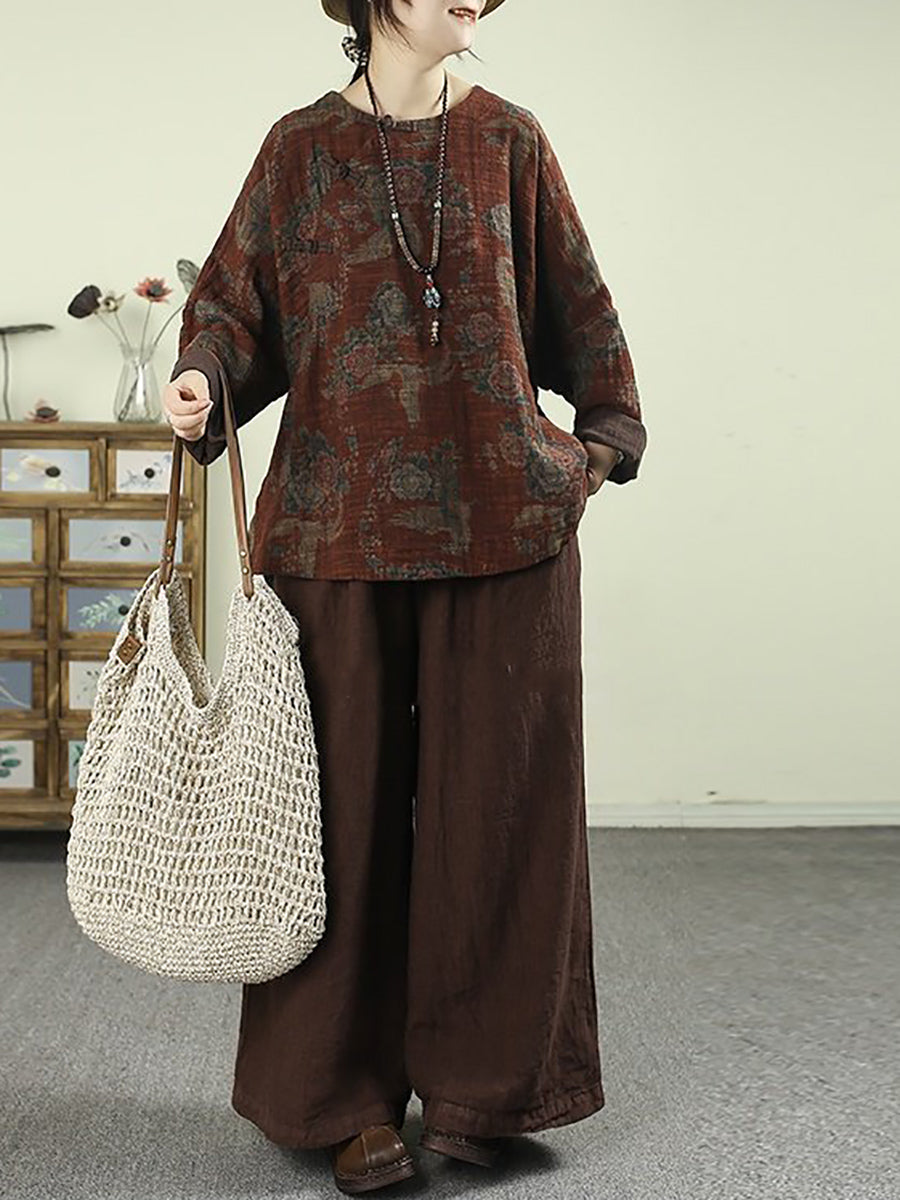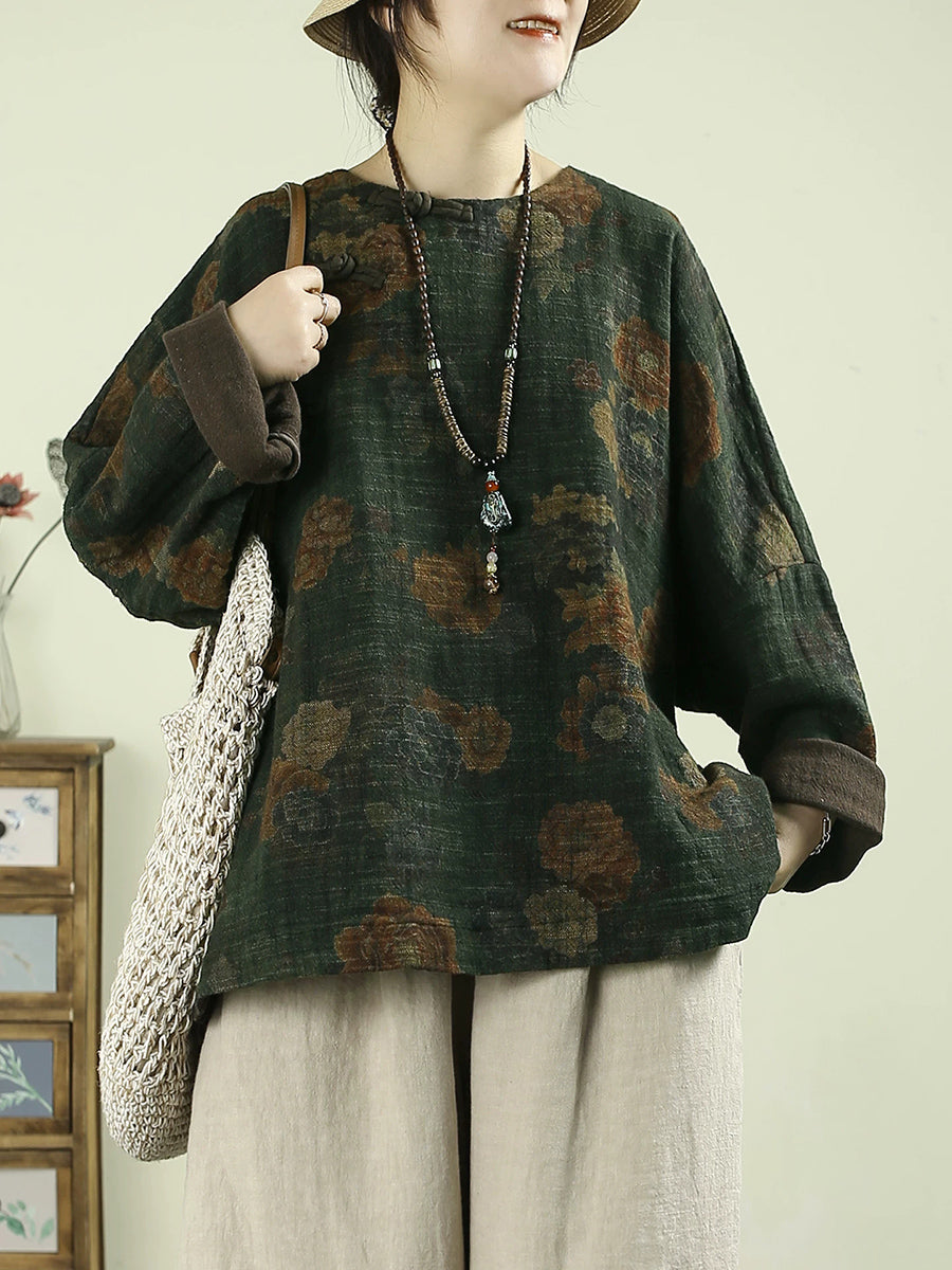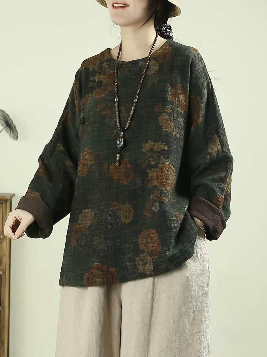 Women Spring Vintage Flower O-Neck 100%Linen Blouse