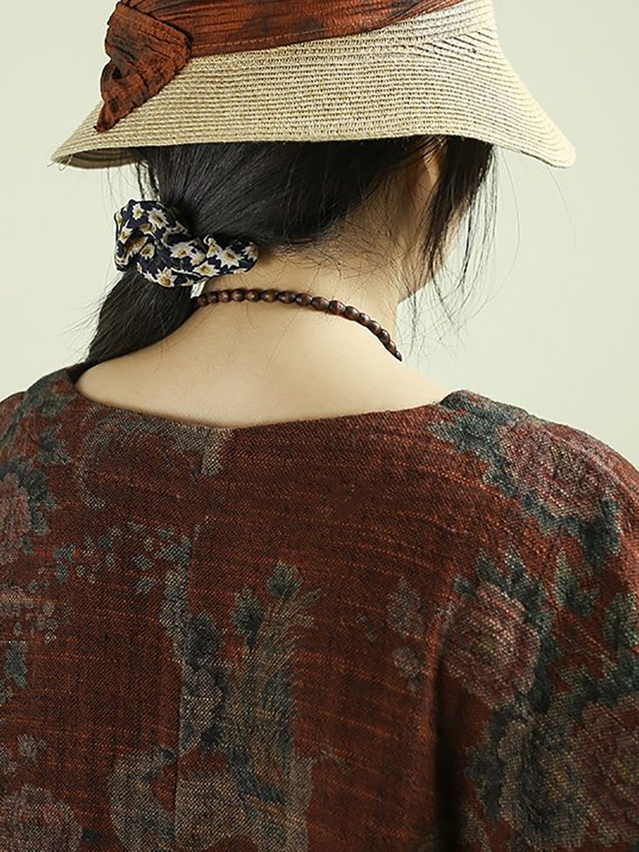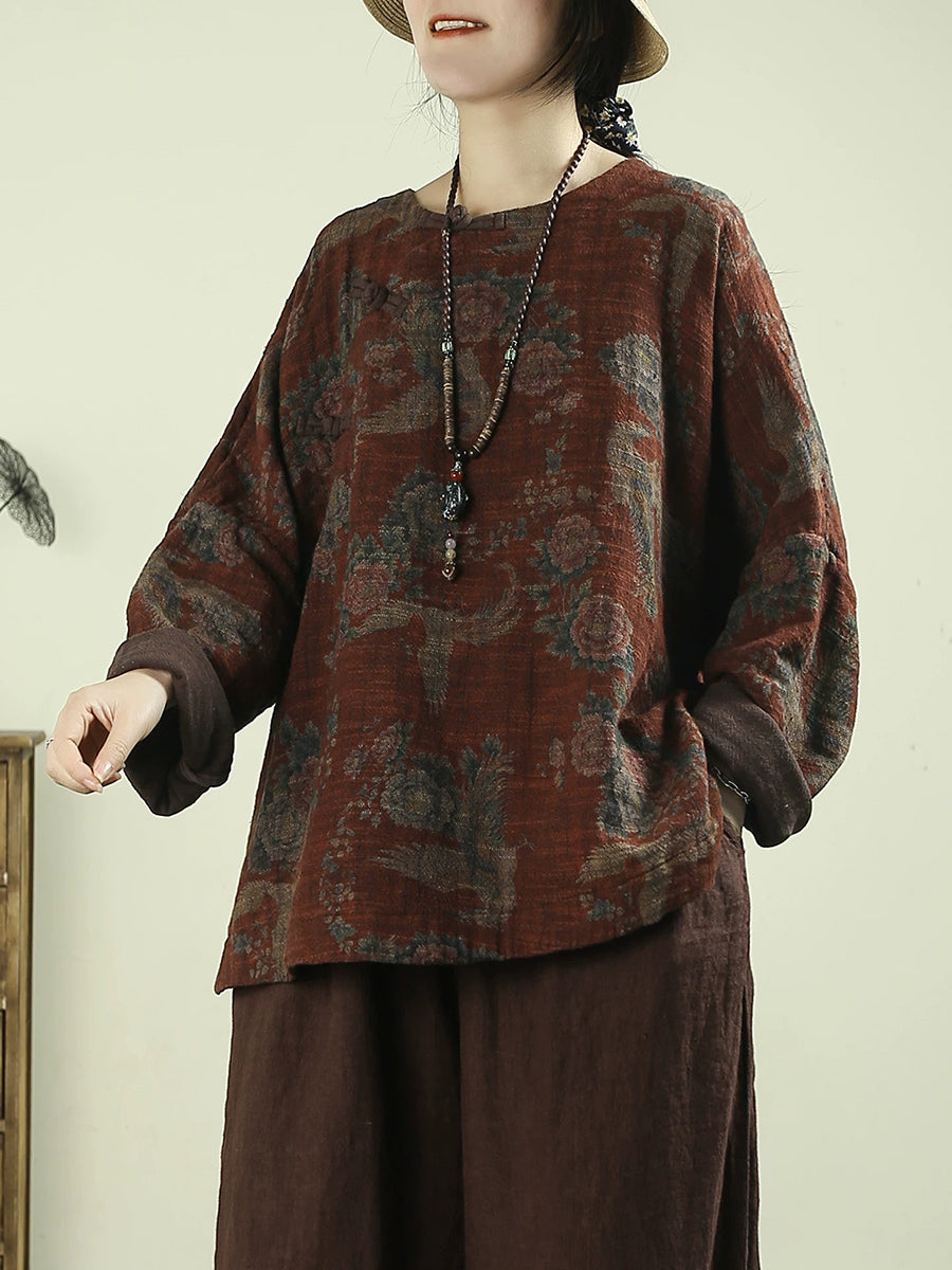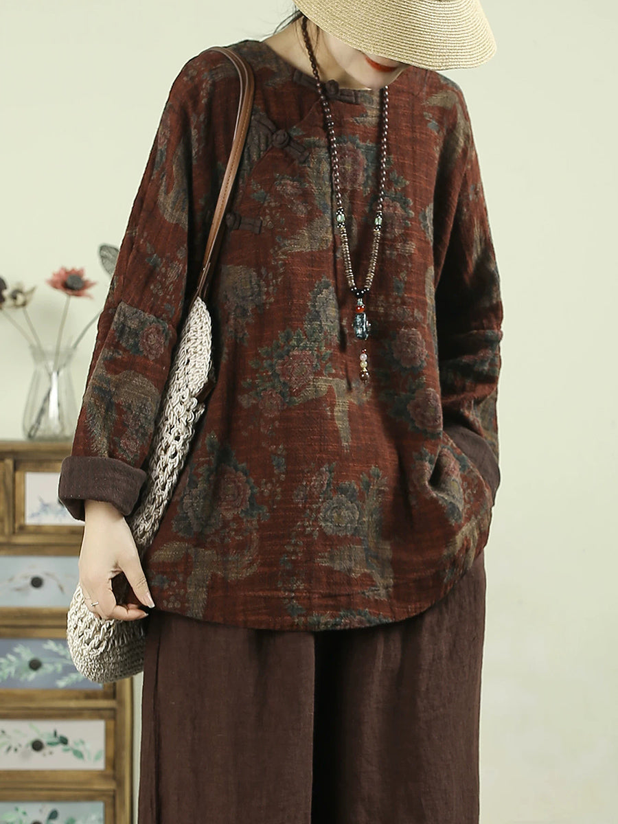 Women Spring Vintage Flower O-Neck 100%Linen Blouse