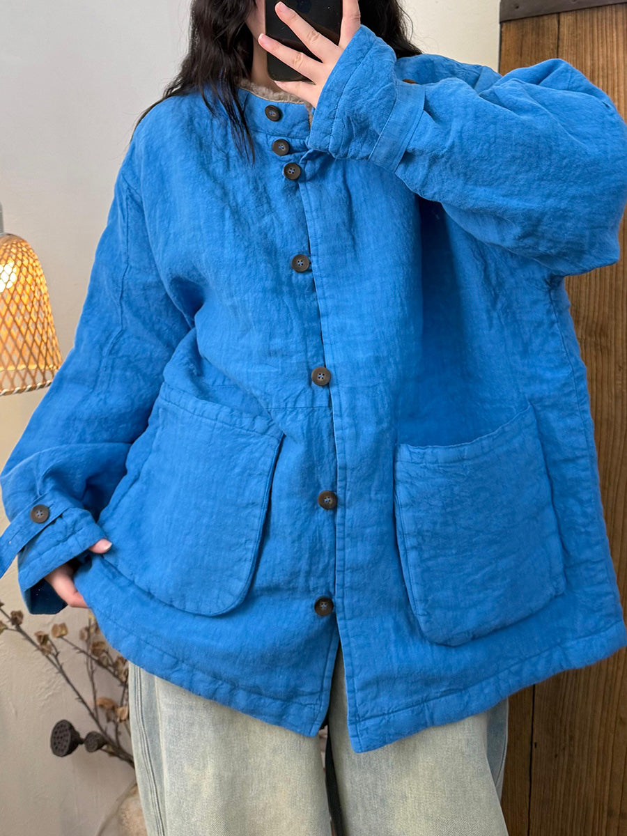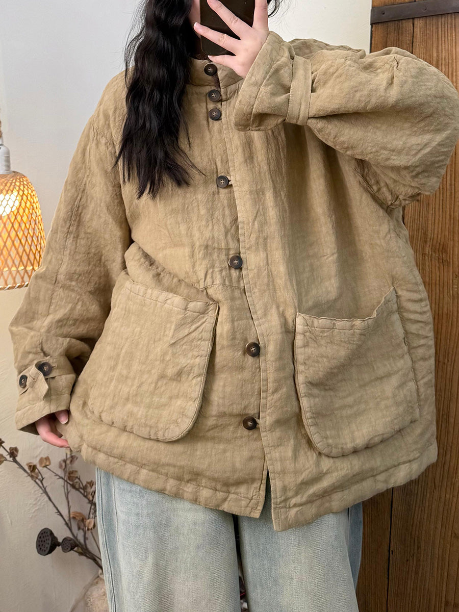 Women Vintage Winter Fleece Linen Stand Collar Coat