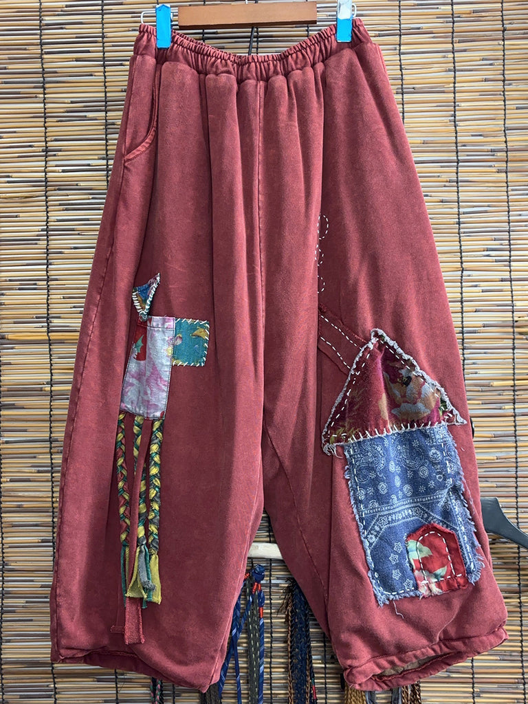 Women Winter Retro Patchwork O-Neck Tassel Suits