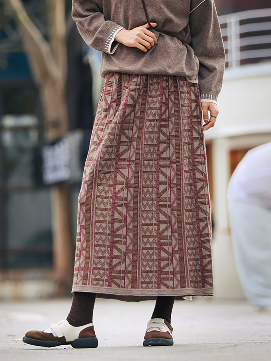 Women Autumn Retro Jacquard A-Shape Cotton Skirt