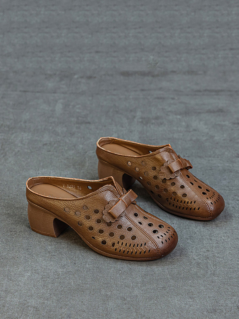 Women Summer Genuine Leather Hollow Out Mid Heel Slippers
