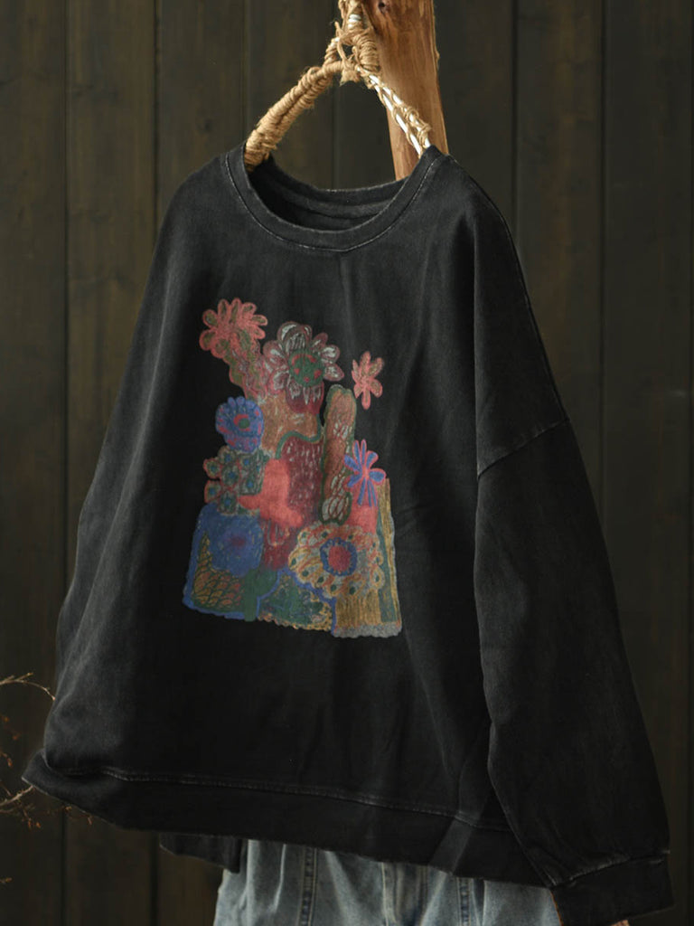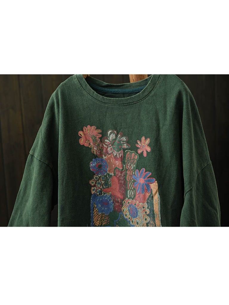 Women Autumn Artsy Flower O-Neck Cotton Blouse