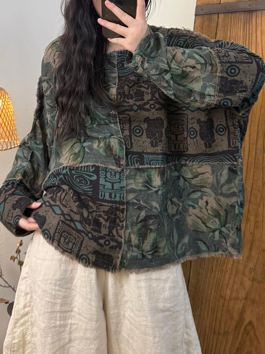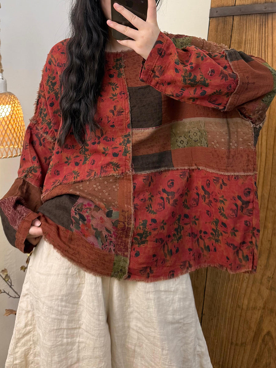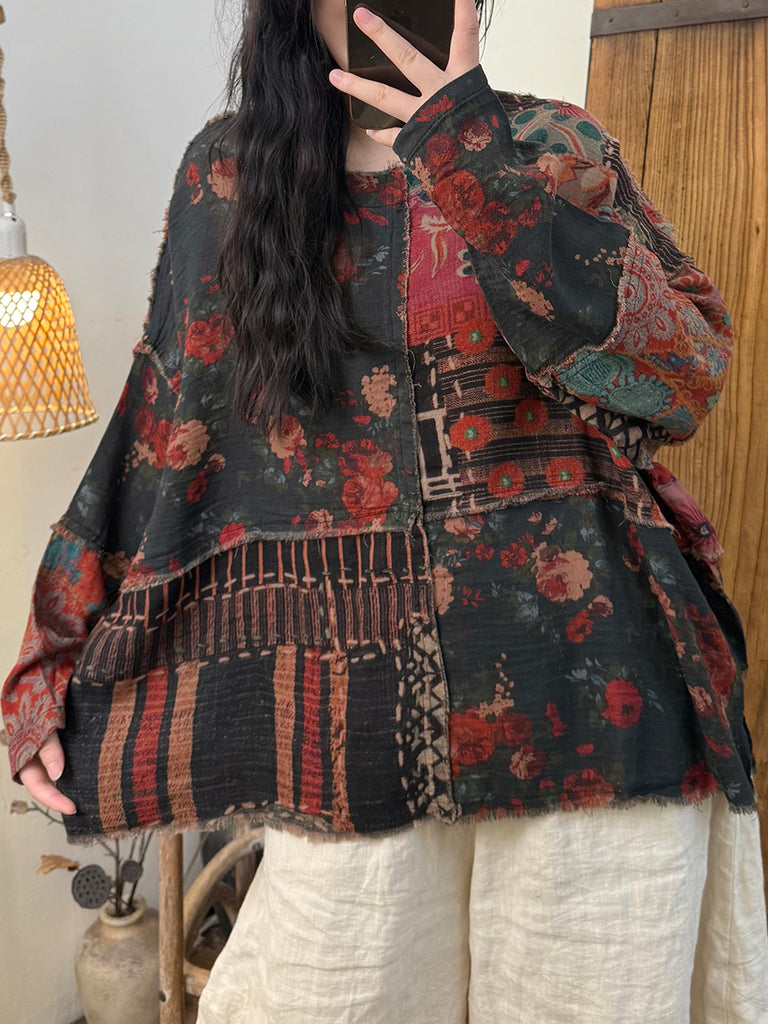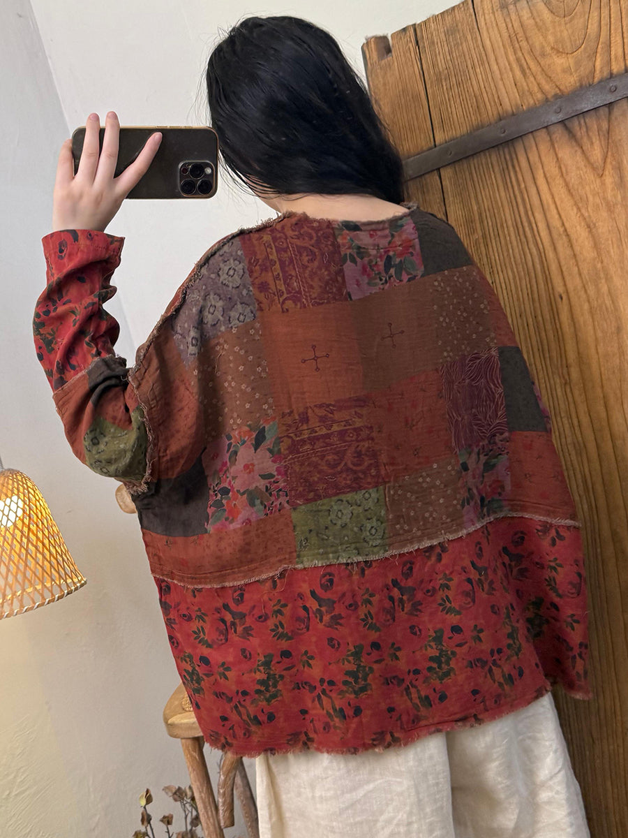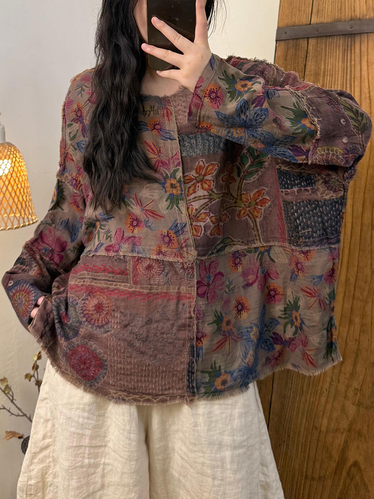 Women Retro Autumn Flower Spliced O-Neck Cotton Coat