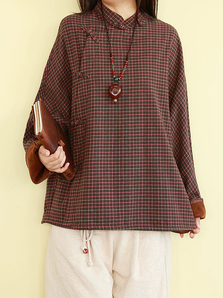 This winter essential combines traditional ethnic design with contemporary comfort. Crafted from a linen-cotton blend, the blouse features a distinctive stand collar and full-length raglan sleeves that provide both structure and ease of movement. The classic plaid pattern adds timeless appeal, while the thoughtfully designed silhouette works seamlessly across autumn and winter seasons. Perfect for layering or wearing as a standalone piece, this blouse bridges cultural aesthetics with practical everyday wear.