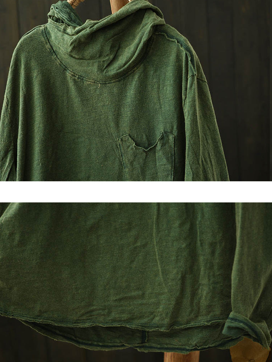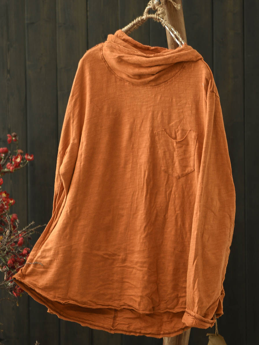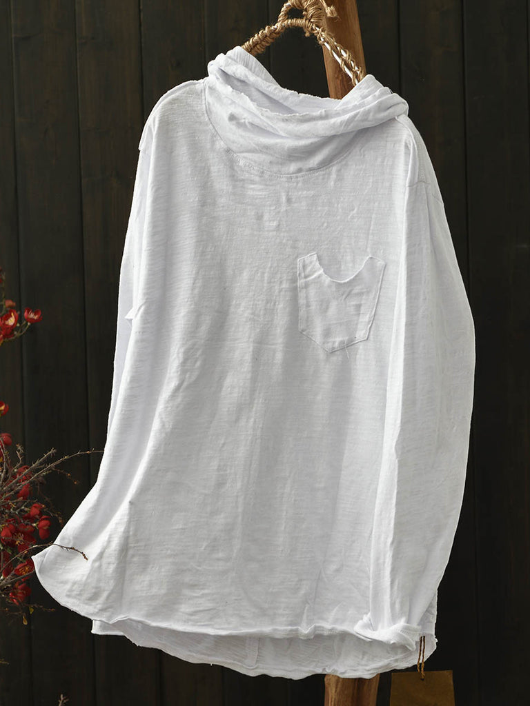 Women Winter Retro Pure Color Cotton Hooded Blouse