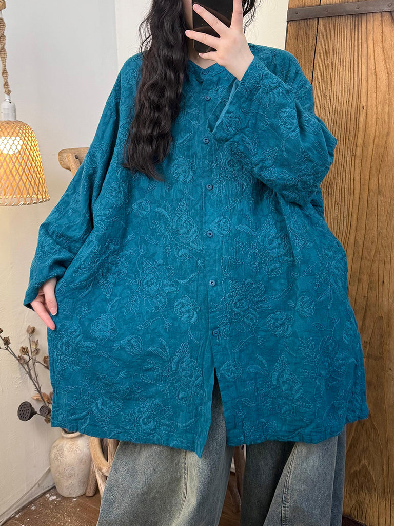 Women Autumn Artsy Embroidery Linen Stand Collar Shirt
