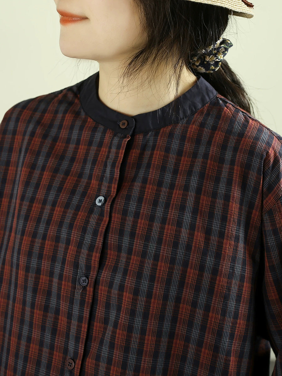 Women Spring Retro Plaid 100%Cotton Stand Collar Shirt